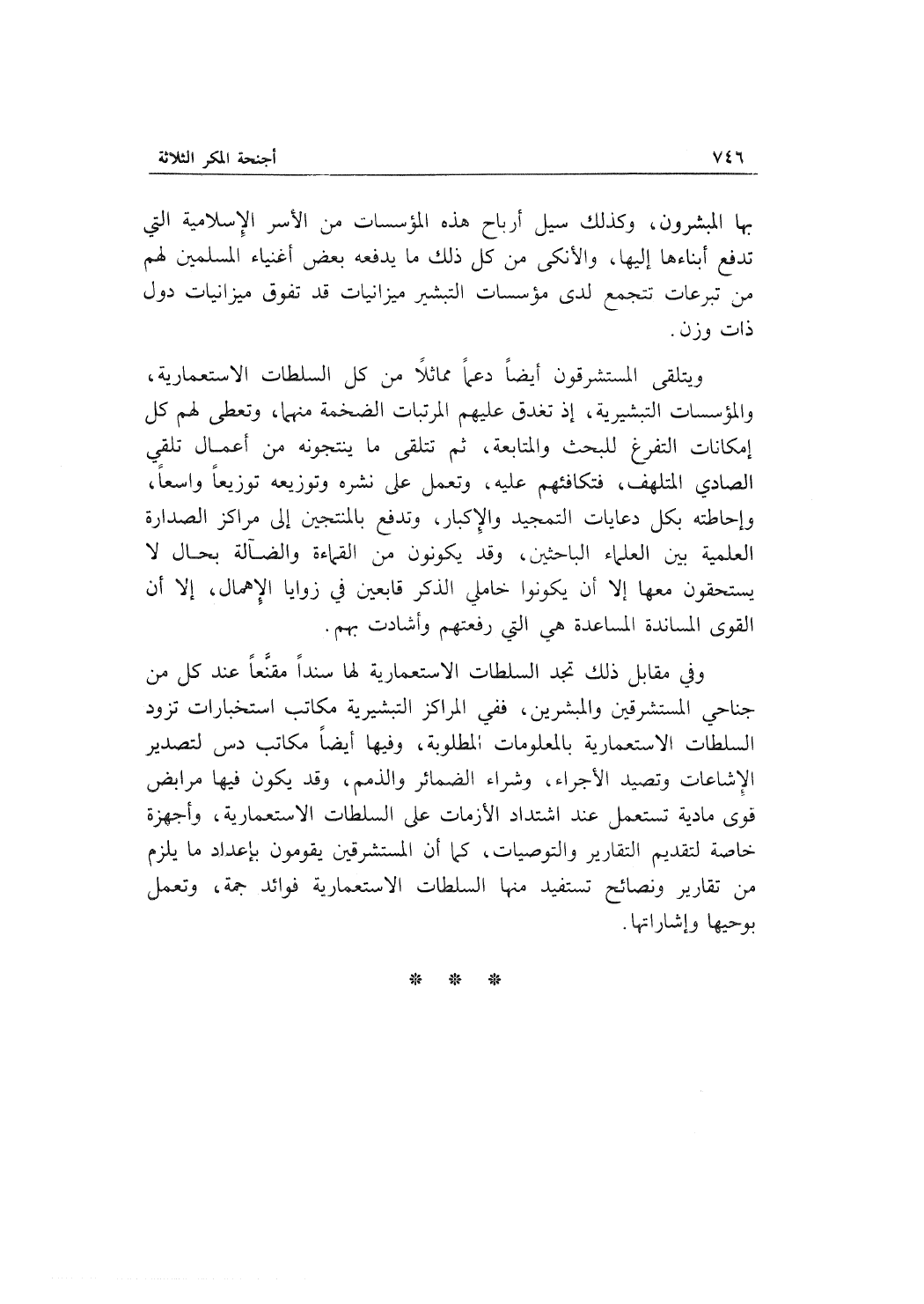 وفي مقابل ذلك تجد السلطات الاستعمارية لها سنداً مقنَّعاً عند كل من جناحي المستشرقين والمبششرين، ففي المراكز التبشيرية مكاتب استخبارات تزود السلطات الاستعمارية بالمعلومات المطلوبة. وفيها أيضاً مكاتب دس لتصدير الإشاعات وتصيد الأجراء، وشراء الضمائر والذمم، وقد يكون فيها مرابض قوى مادية تستعمل عند اشتداد الأزمات على السلطات الاستعمارية، وأجهزة خاصة لتقديم التقارير والتوصيات. كما أن المستشرقين يقومون بإعداد ما يلزم من تقارير ونصائح تستفيد منها السلطات الاستعمارية فوائد جمة، وتعمل بوحيها وإشاراتها.
