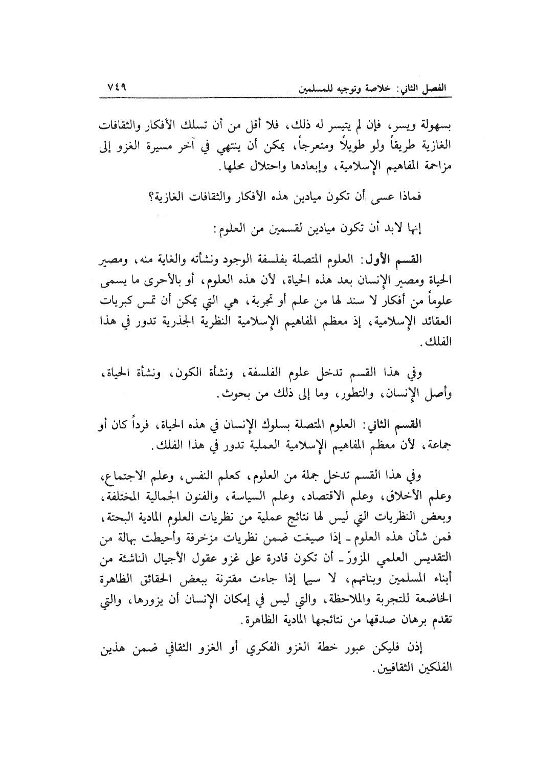 القسم الأول: العلوم المتصلة بفلسفة الوجود ونشأته والغاية منه ومصير الحياة ومصير الإنسان بعد هذه الحياة. لأن هذه العلوم أو بالأ؛ رى ما يسمى علوماً من أفكار لا سند لها من علم أو تجربة هي التي يمكن أن تمس كبريات العقائد الإسلامية. إذ معظم المفاهيم الإسلامية النظرية الجذرية تدور في هذا الفلك.