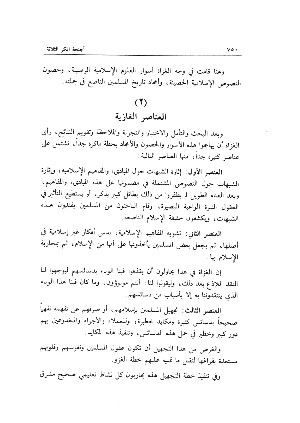 العنصر الثالث: تجهيل المسلمين بإسلامهم، أو صرفهم عن تفهمه تفهماً صحيحاً بدسائس كثيرة ومكايد خطيرة، وللعملاء والأجراء، والمخدوعين بهم دور كبير وخطير في حمل هذه الدسائس، وتنفيذ هذه المكايد.