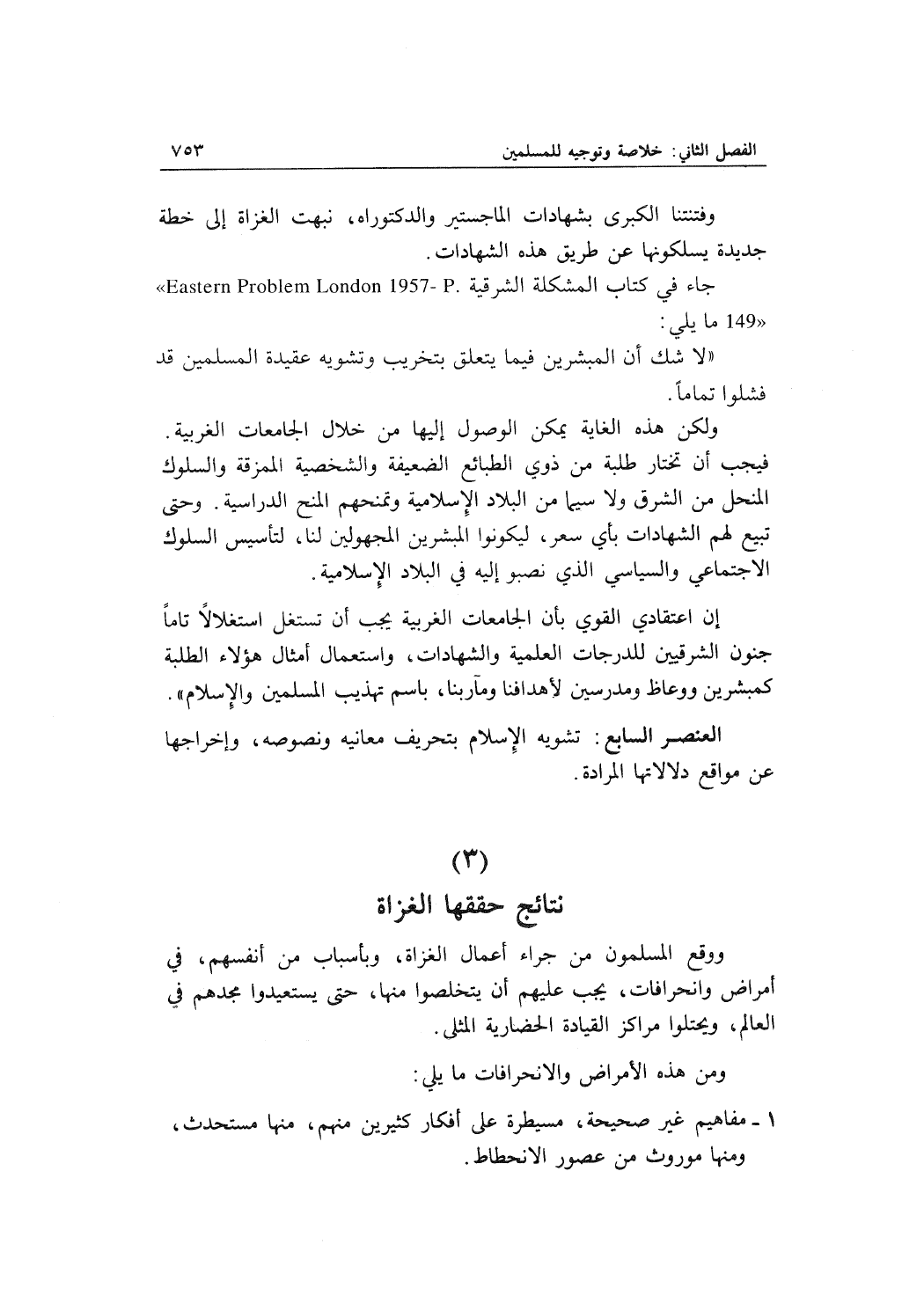إن اعتقادي القوي بأن الجامعات الغربية يجب أن تستغل استغلالاً تاماً جنون الشرقيين للدرجات العلمية والشهادات، واستعمال أمثال هؤلاء الطلبة كمبشرين ووعاظ ومدرسين لأهدافنا ومآربنا، باسم تهذيب المسلمين والإسلام".