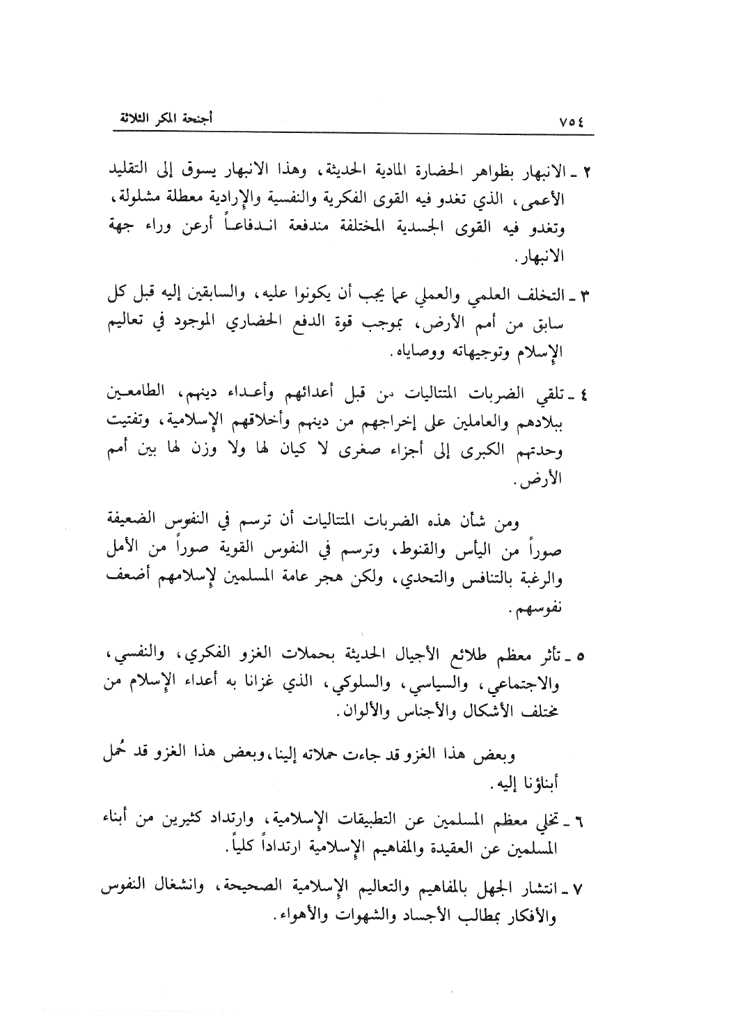 5- تأثر معظم طلائع الأجيال الحديثة بحملات الغزو الفكري والنفسي والاجتماعي والسياسي والسلوكي الذي غزانا به أعداء الإسلام من مختلف الأشكال والأجناس والألوان.