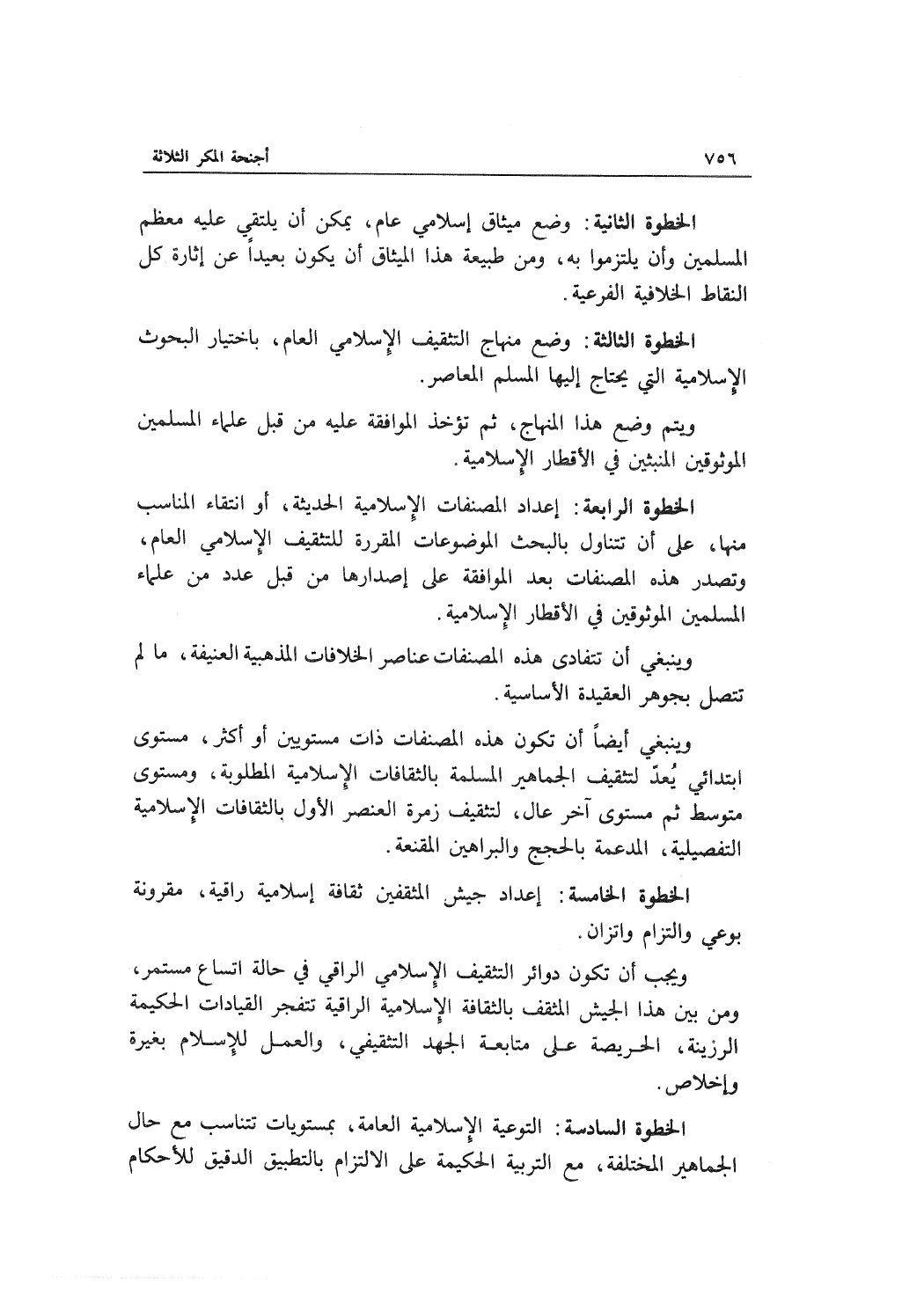 الخطوة الرابعة: إعداد المصنفات الإسلامية الحديثة، أو انتقاء المناسب منها، على أن تتناول بالبحث الموضوعات المقررة للتثقيف الإسلامي العام، وتصدر هذه المصنفات بعد الموافقة على إصدارها من قبل عدد من علماء المسلمين الموثوقين في الأقطار الإسلامية.