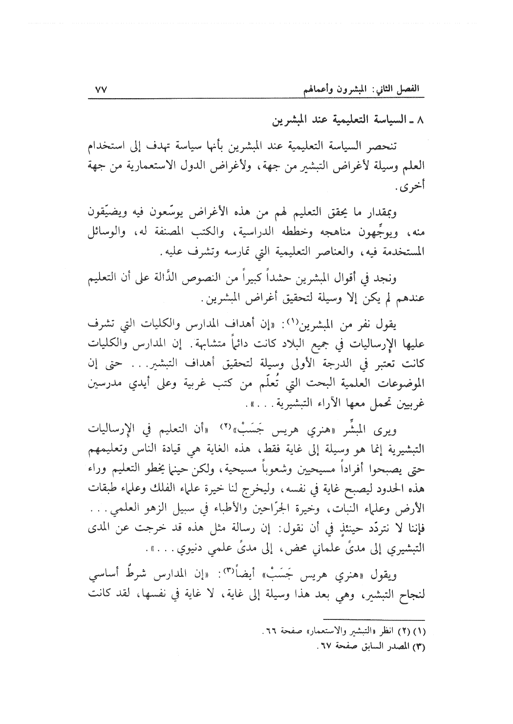 ونجد في أقوال المبشرين حشداً كبيراً من النصوص الدالة على أن التعليم عندهم لم يكن إلا وسيلة لتحقيق أغراض المبشرين.