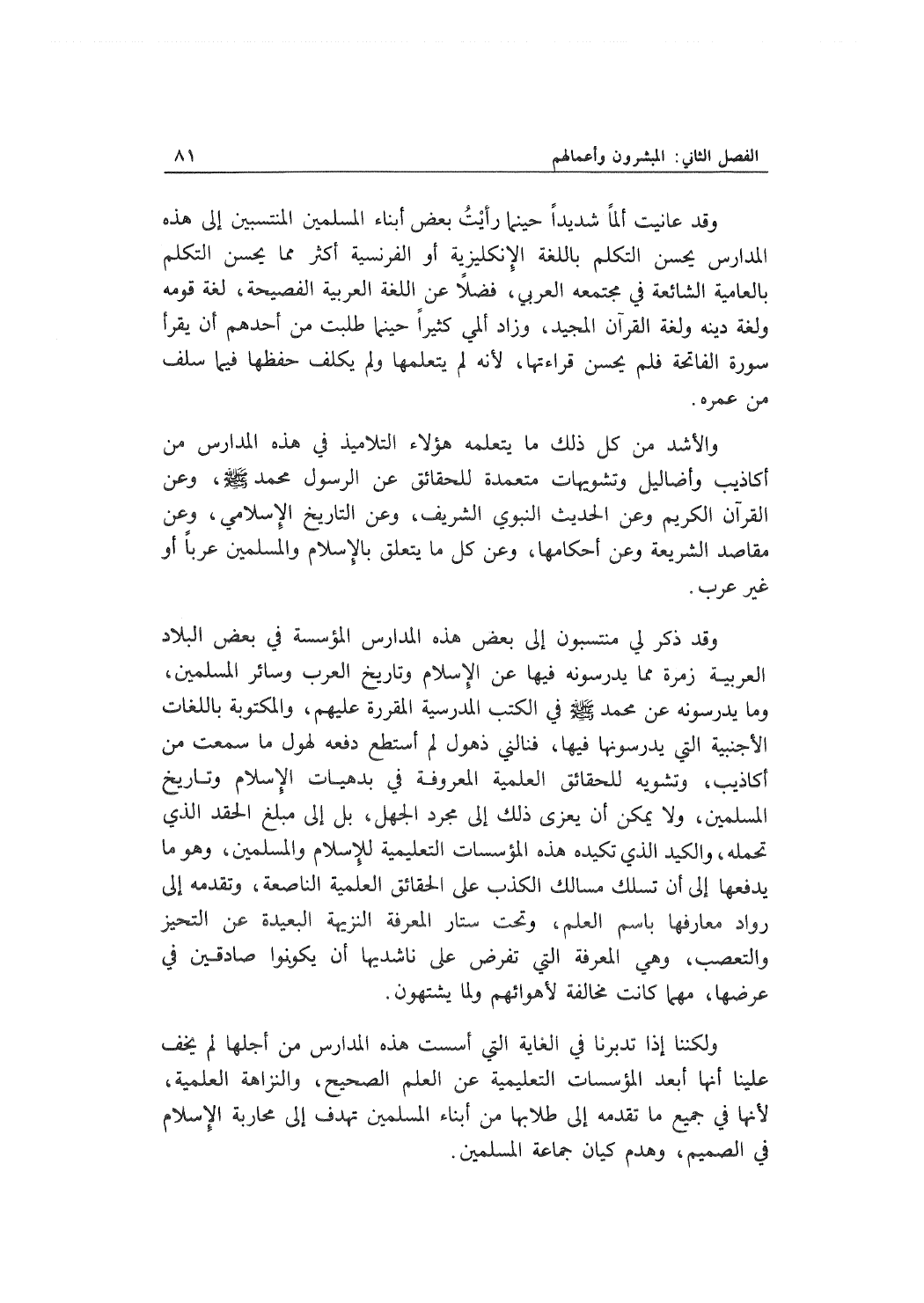 وقد عانيت ألماً شديداً حينما رأيتُ بعض أبناء المسلمين المنتسبين إلى هذه المدارس يحسن التكلم باللغة الإنكليزية أو الفرنسية أكثر مما يحسن التكلم بالعامية الشائعة في مجتمعه العربي، فضلاً عن اللغة العربية الفصيحة، لغة قومه ولغة دينه ولغة القرآن المجيد. وزاد ألمي كثيراً حينما طلبت من أحدهم أن يقرأ سورة الفاتحة فلم يحسن قراءتها، لأنه لم يتعلمها ولم يكلف حفظها فيما سلف من عمره.