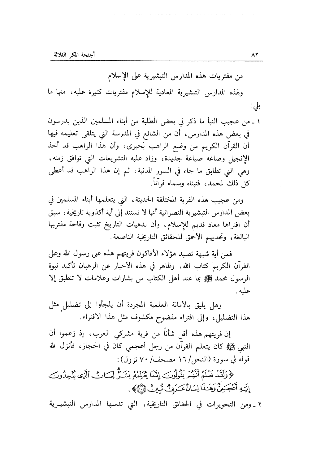 1- من عجيب النبأ ما ذكر لي بعض الطلبة من أبناء المسلمين الذين يدرسون في بعض هذه المدارس، أن من الشائع في المدرسة التي يتلقى تعليمه فيها أن القرآن الكريم من وضع الراهب بَحيرى، وأن هذا الراهب قد أخذ الإنجيل وصاغه صياغة جديدة، وزاد عليه التشريعات التي توافق زمنه، وهي التي تطابق ما جاء في السور المدنية، ثم إن هذا الراهب قد أعطى كل ذلك لمحمد، فتبناه وسماه قرآناً.