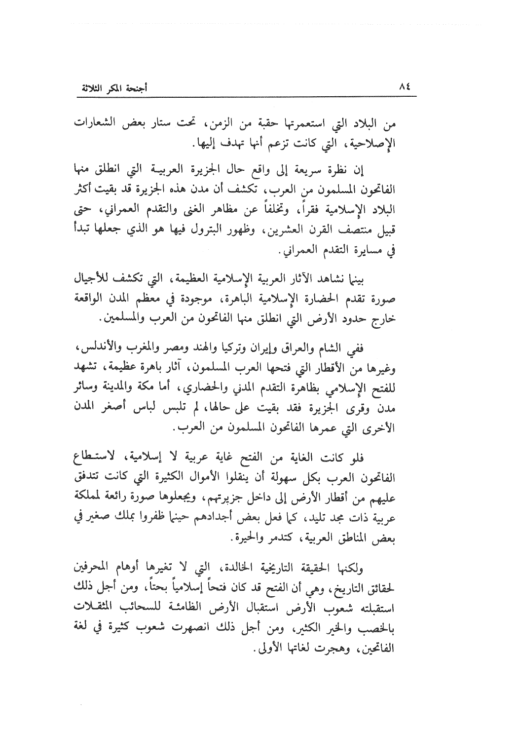 ولكنها الحقيقة التاريخية الخالدة، التي لا تغيرها أوهام المحرفين لحقائق التاريخ، وهي أن الفتح قد كان فتحاً إسلامياً بحتاً، ومن أجل ذلك استقبلته شعوب الأرض استقبال الأرض الظامئة للسحاب المثقلات بالخصب والخير الكثير، ومن أجل ذلك انصهرت شعوب كثيرة في لغة الفاتحين، وهجرت لغاتها الأولى.