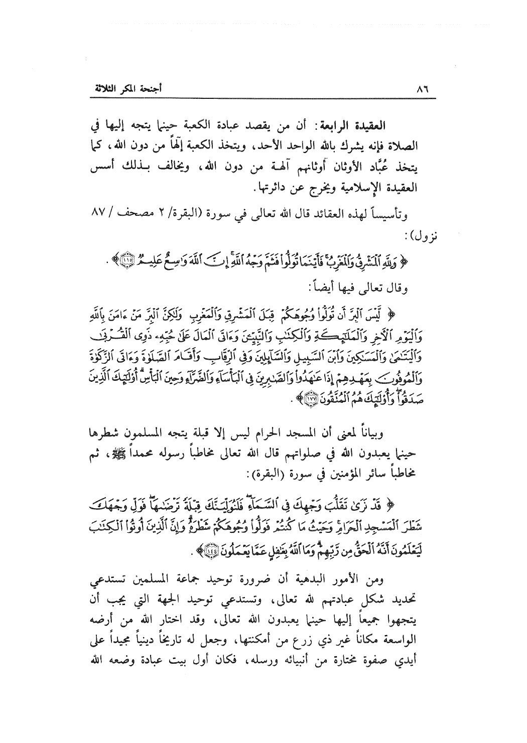 العقيدة الرابعة: أن من يقصد عبادة الكعبة حينما يتجه إليها في الصلاة فإنه يشرك بالله الواحد الأحد، ويتخذ الكعبة إلهاً من دون الله، كما يتخذ عُبَّاد الأوثان أوثانهم آلهة من دون الله، ويخالف بذلك أسس العقيدة الإسلامية ويخرج عن دائرتها.