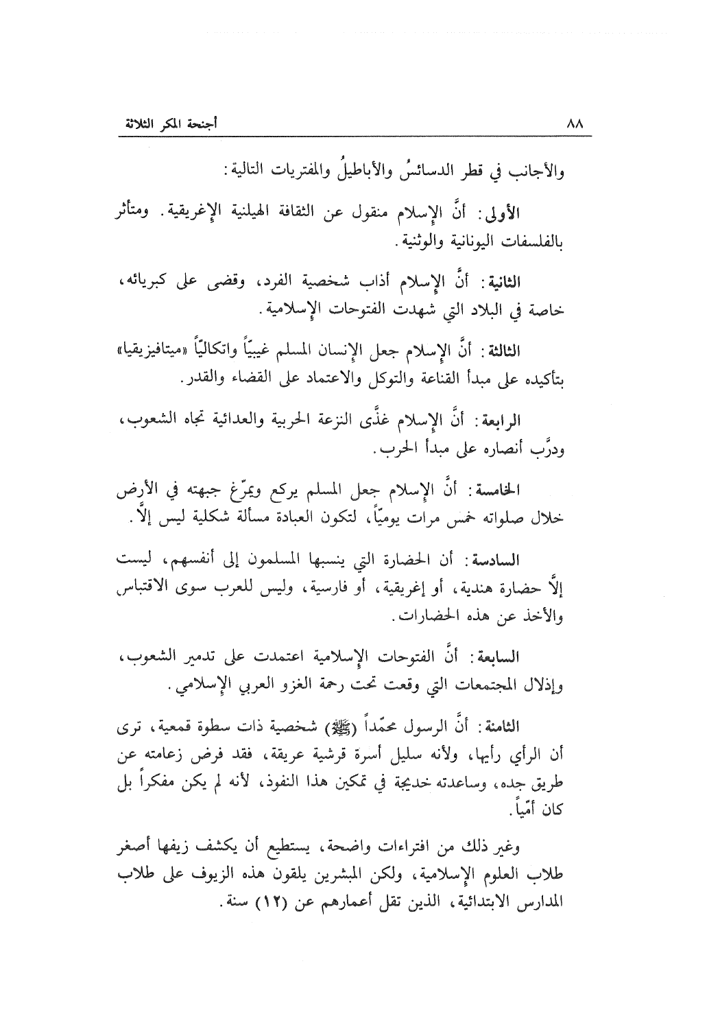 وغير ذلك من افتراءات واضحة، يستطيع أن يكشف زيفها أصغر طلاب العلوم الإسلامية , ولكن المبشرين يلقون هذه الزيوف على طلاب المدارس الابتدائية الذين تقل أعمارهم عن (12) سنة.