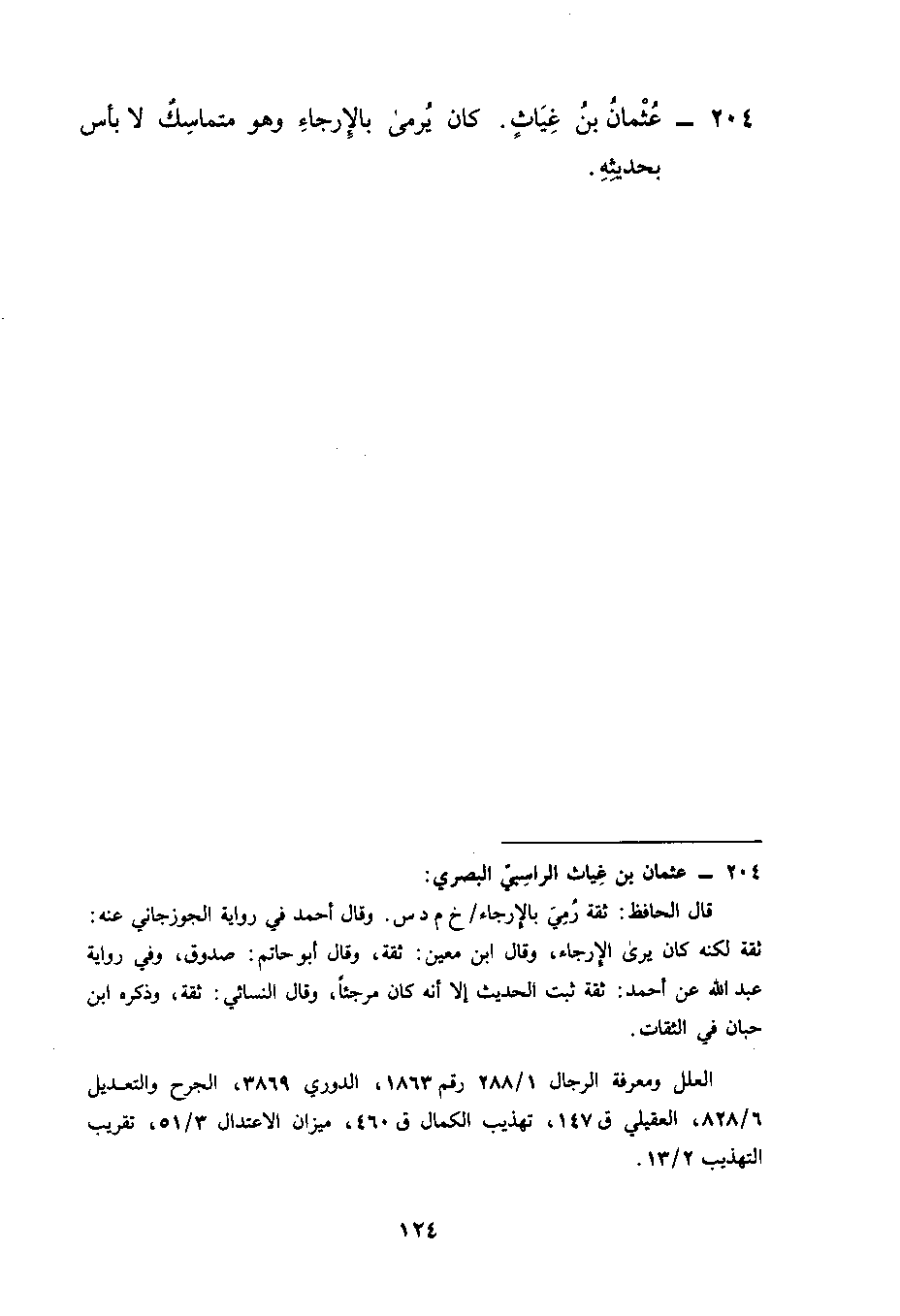 204 عثمان بن غياث كان يرمى بالإرجاء وهو متماسك لا بأس بحديثه