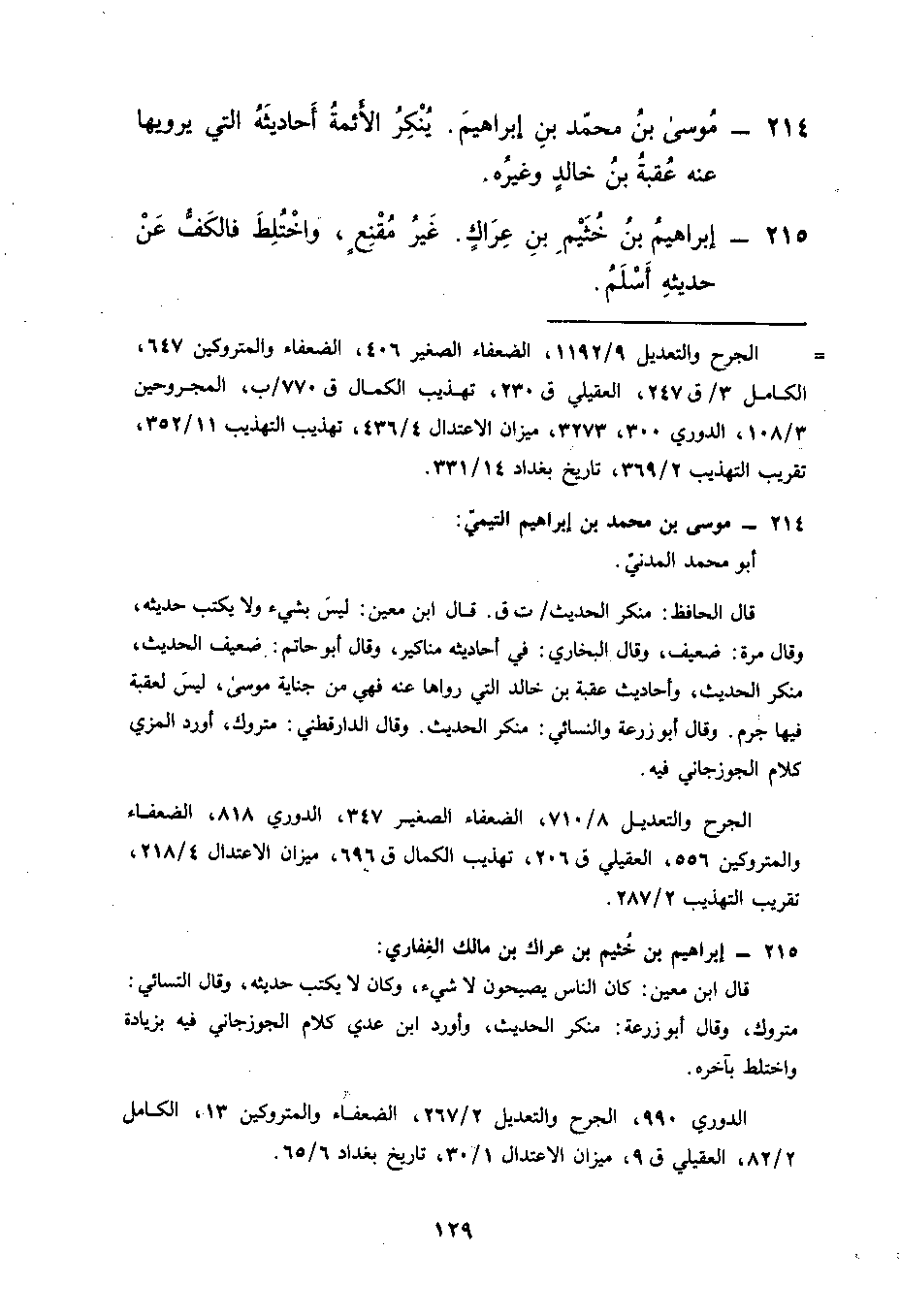 214 موسى بن محمد بن إبراهيم ينكر الأئمة أحاديثه التي يرويها عنه عقبة بن خالد وغيره