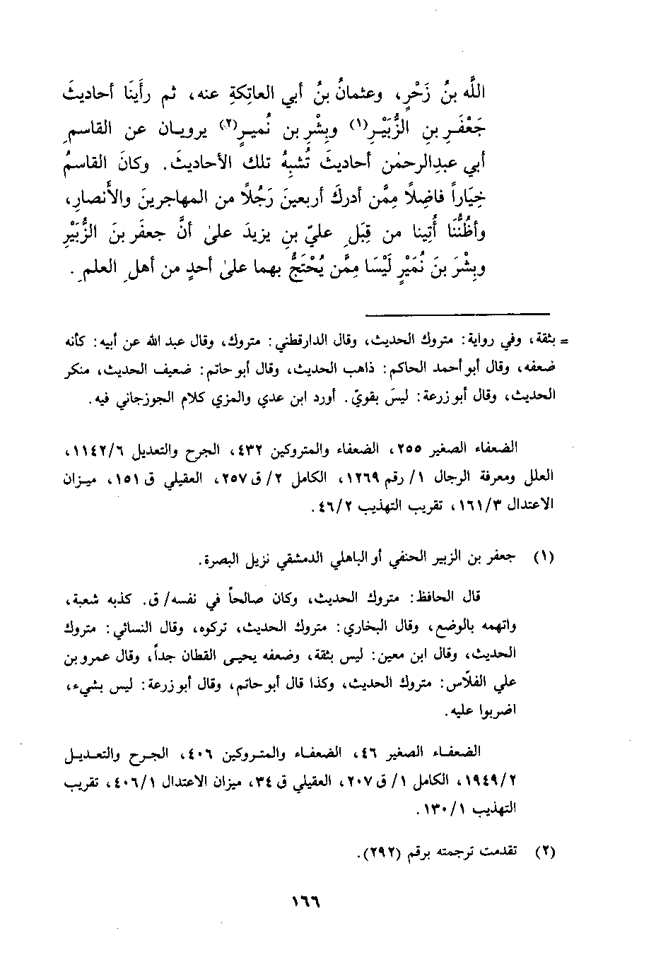الله بن زحر وعثمان بن أبي العاتكة عنه ثم رأينا أحاديث جعفر بن الزبير وبشر بن نمير يرويان عن القاسم أبي عبدالرحمن أحاديث تشبه تلك الأحاديث وكان القاسم خيارا فاضلا ممن أدرك أربعين رجلا من المهاجرين والأنصار وأظننا أتينا من قبل علي بن يزيد على أن جعفر بن الزبير وبشر بن نمير ليسا ممن يحتج بهما على أحد من أهل العلم