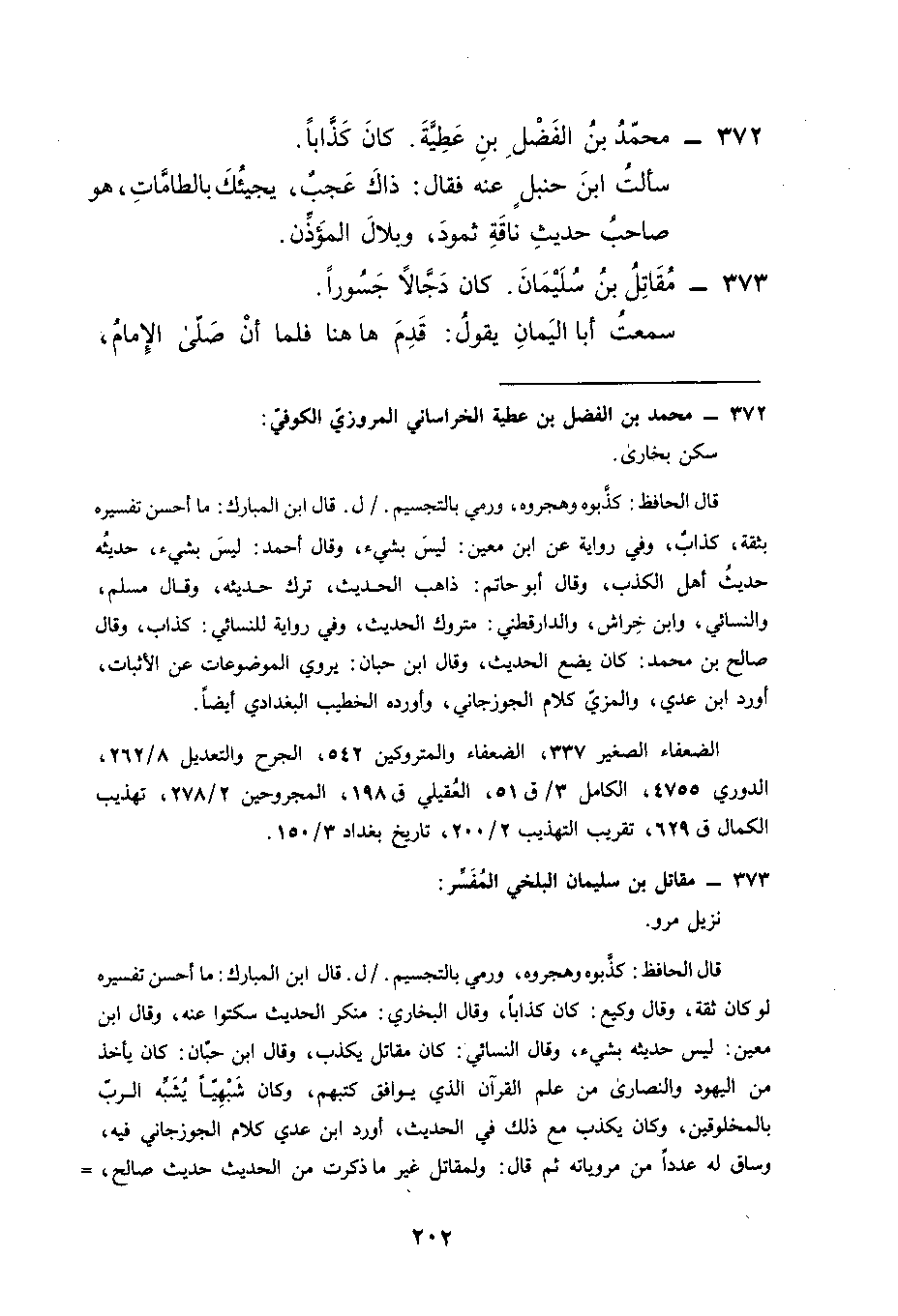 372 محمد بن الفضل بن عطية كان كذابا سألت ابن حنبل عنه فقال ذاك عجب يجيئك بالطامات هو صاحب حديث ناقة ثمود وبلال المؤذن
