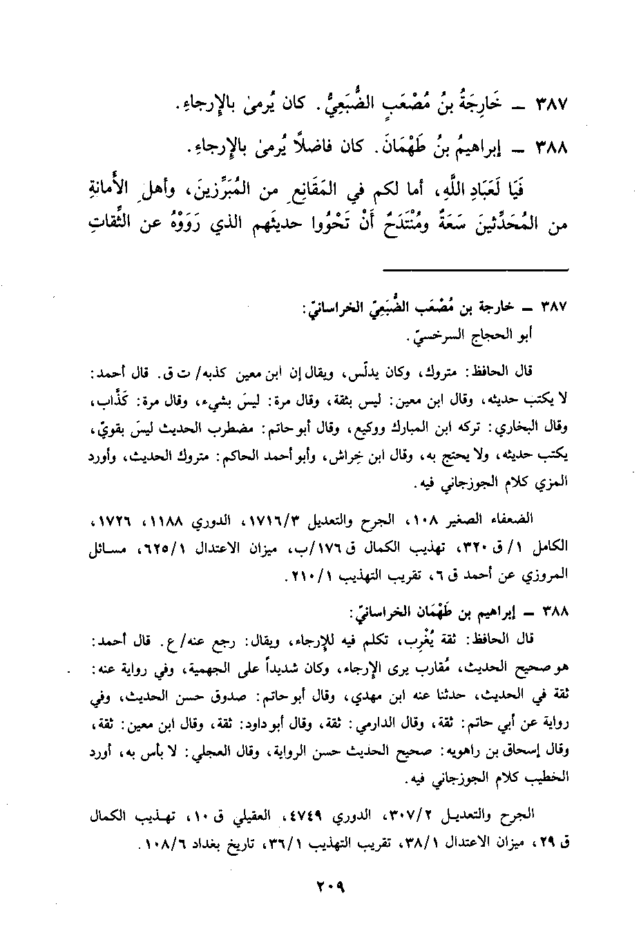 388 إبراهيم بن طهمان كان فاضلا يرمى بالإرجاء فيا لعباد الله أما لكم في المقانع من المبرزين وأهل الأمانة من المحدثين سعة ومنتدح أن تحووا حديثهم الذي رووه عن الثقات