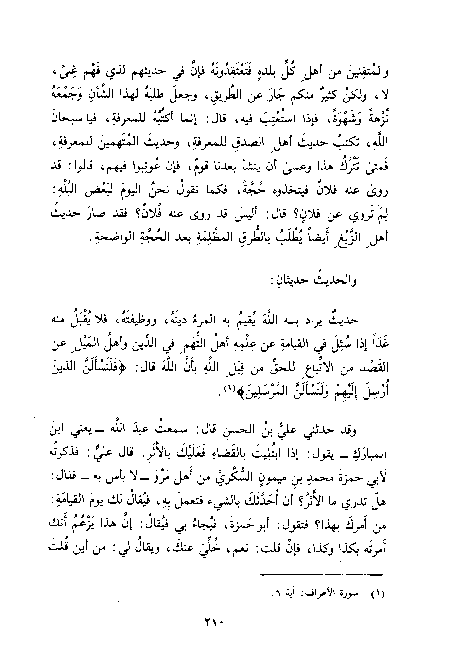 والمتقنين من أهل كل بلدة فتعتقدونه فإن في حديثهم لذي فهم غنى لا ولكن كثير منكم جار عن الطريق وجعل طلبه لهذا الشأن وجمعه نزهة وشهوة فإذا استعتب فيه قال إنما أكتبه للمعرفة فيا سبحان الله تكتب حديث أهل الصدق للمعرفة وحديث المتهمين للمعرفة فمتى تترك هذا وعسى أن ينشأ بعدنا قوم فإن عوتبوا فيهم قالوا قد روى عنه فلان فيتخذوه حجة فكما نقول نحن اليوم لبعض البله لم تروي عن فلان قال أليس قد روى عنه فلان فقد صار حديث أهل الزيغ أيضا يطلب بالطرق المظلمة بعد الحجة الواضحة والحديث حديثان حديث يراد به الله يقيم به المرء دينه ووظيفته فلا يقبل منه غدا إذا سئل في القيامة عن علمه أهل التهم في الدين وأهل الميل عن القصد من الاتباع للحق من قبل الله بأن الله قال { فلنسألن الذين أرسل إليهم ولنسألن المرسلين } وقد حدثني علي بن الحسن قال سمعت عبدالله يعني ابن المبارك يقول إذا ابتليت بالقضاء فعليك بالأثر قال علي فذكرته لأبي حمزة محمد بن ميمون السكري من أهل مرو لا بأس به فقال هل تدري ما الأثر أن أحدثك بالشيء فتعمل به فيقال لك يوم القيامة من أمرك بهذا فتقول أبو حمزة فيجاء بي فيقال إن هذا يزعم أنك أمرته بكذا وكذا فإن قلت نعم خلي عنك ويقال لي من أين قلت