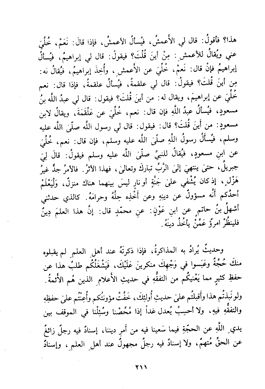 هذا فأقول قال لي الأعمش فيسأل الأعمش فإذا قال نعم خلي عني ويقال للأعمش من أين قلت فيقول قال لي إبراهيم فيسأل إبراهيم فإن قال نعم خلي عن الأعمش وأخذ إبراهيم فيقال له من أين قلت فيقول قال لي علقمة فيسأل علقمة فإذا قال نعم خلي عن إبراهيم ويقال له من أين قلت فيقول قال لي عبدالله بن مسعود من أين قلت قال فيقول قال لي رسول الله صلى الله عليه وسلم فيسأل رسول الله صلى الله عليه وسلم فإن قال نعم خلي عن ابن مسعود فيقال للنبي صلى الله عليه وسلم فيقول قال لي جبريل حتى ينتهي إلى الرب تبارك وتعالى فهذا الأثر فالأمر جد غير هزل إذ كان يشفي على جنة أو نار ليس بينهما هناك منزل وليعلم أحدكم أنه مسؤول عن دينه وعن أخذه حله وحرامه كالذي حدثني أشهل بن حاتم عن ابن عون عن محمد قال إن هذا العلم دين فلينظر امرؤ عمن يأخذ دينه وحديث يراد به المذاكرة فإذا ذكرته عند أهل العلم لم يقبلوه منك حجة وعبسوا في وجهك منكرين عليك فيشغلكم طلب هذا عن حفظ كثير مما يعنيكم من التفقه في حديث الأعلام الذين هم الأئمة ولو نبذتم هذا وأقبلتم على حديث أولئك خفت مؤونتكم وأعنتم على حفظه والتفقه فيه ولا أحسب يعدل غدا إذا محصنا وسئلنا في الموقف بين يدي الله عن الحجة فيما سعينا فيه من أمر ديننا إسناد فيه رجل زائغ عن الحق متهم ولا إسناد فيه رجل مجهول عند أهل العلم وإسناد
