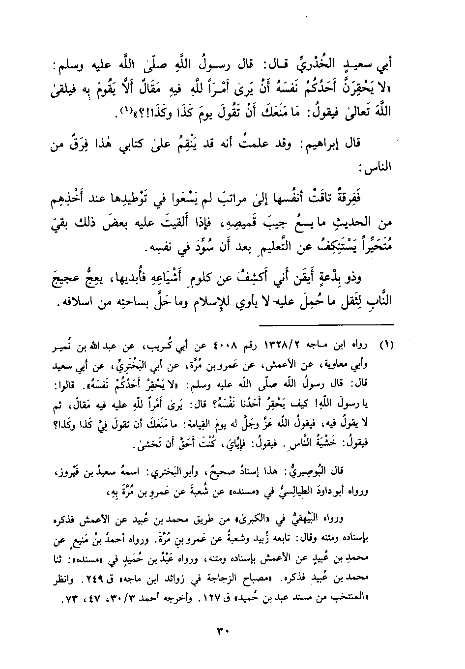 أبي سعيد الخدري قال قال رسول الله صلى الله عليه وسلم لا يحقرن أحدكم نفسه أن يرى أمرا لله فيه مقال ألا يقوم به فيلقى الله تعالى فيقول ما منعك أن تقول يوم كذا وكذا قال إبراهيم وقد علمت أنه قد ينقم على كتابي هذا فرق من الناس ففرقة تاقت أنفسها إلى مراتب لم يسعوا في توطيدها عند أخذهم من الحديث ما يسع جيب قميصه فإذا ألقيت عليه بعض ذلك بقي متحيرا يستنكف عن التعليم بعد أن سود في نفسه وذو بدعة أيقن أني أكشف عن كلوم أشياعه فأبديها يعج عجيج الناب لثقل ما حمل عليه لا يأوي للإسلام وما حل بساحته من أسلافه