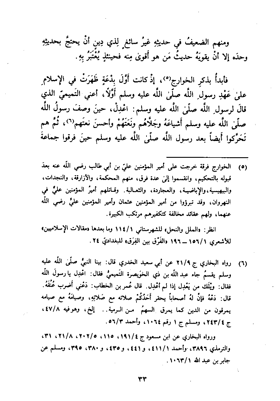 ومنهم الضعيف في حديثه غير سائغ لذي دين أن يحتج بحديثه وحده إلا أن يقويه حديث من هو أقوى منه فحينئذ يعتبر به فأبدأ بذكر الخوارج إذ كانت أول بدعة ظهرت في الإسلام على عهد رسول الله صلى الله عليه وسلم أولا أعني التميمي الذي قال لرسول الله صلى الله عليه وسلم اعدل حين وصف رسول الله صلى الله عليه وسلم أشياعه وجلاهم ونعتهم وأحسن نعتهم ثم هم تحركوا أيضا بعد رسول الله صلى الله عليه وسلم حين فرقوا جماعة