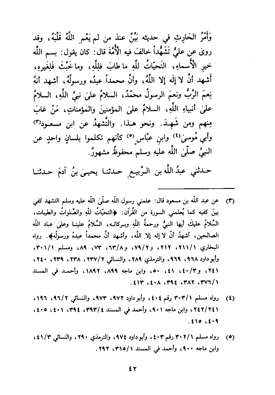 وأمر الحارث في حديثه بين عند من لم يعم الله قلبه وقد روى عن علي تشهدا خالف فيه الأمة قال كان يقول بسم الله خير الأسماء التحيات لله ما طاب فلله وما خبث فلغيره أشهد أن لا إله إلا الله وأن محمدا عبده ورسوله أشهد أنه نعم الرب ونعم الرسول محمد السلام على نبي الله السلام على أنبياء الله السلام على المؤمنين والمؤمنات من غاب منهم ومن شهد ونحو هذا والتشهد عن ابن مسعود وأبي موسى وابن عباس كأنهم تكلموا بلسان واحد عن النبي صلى الله عليه وسلم محفوظ مشهور