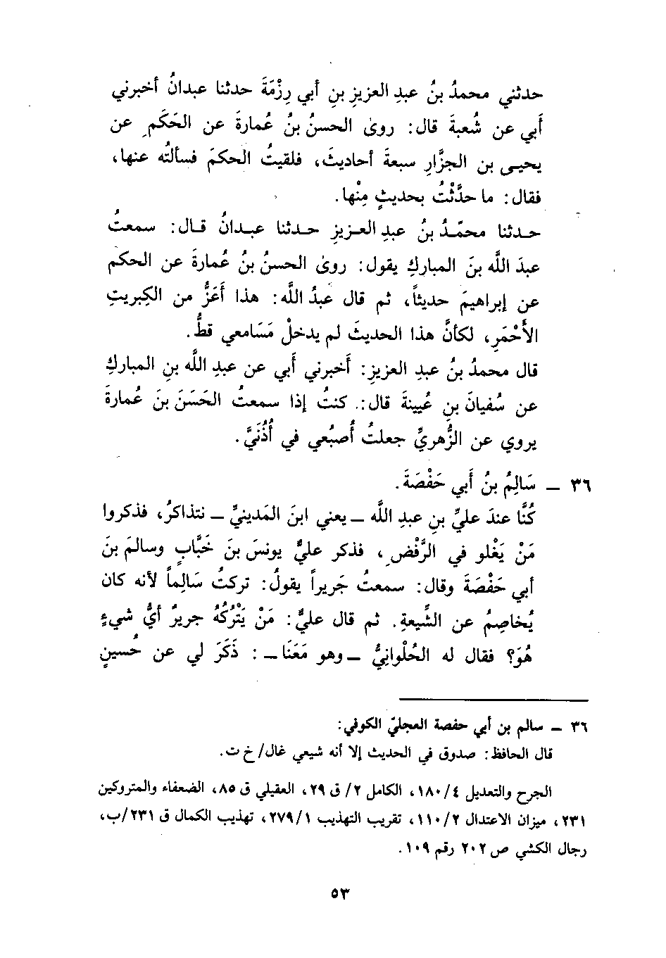 36 سالم بن أبي حفصة كنا عند علي بن عبدالله يعني ابن المديني نتذاكر فذكروا من يغلو في الرفض فذكر علي يونس بن خباب وسالم بن أبي حفصة وقال سمعت جريرا يقول تركت سالما لأنه كان يخاصم عن الشيعة ثم قال علي من يتركه جرير أي شيء هو فقال له الحلواني وهو معنا ذكر لي عن حسين الجعفي أنه قال كان طويل اللحية أحمقها سمعته يقول لبيك قاتل نعثل فقال علي حينئذ هذا والله الجهل والغلو
