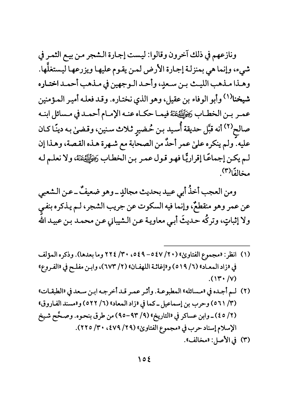 ونازعهم في ذلك آخرون وقالوا: ليست إجارة الشجر من بيع الثمر في شيء، وإنما هي بمنزلة إجارة الأرض لمن يقوم عليها ويزرعها ليستغلَّها. وهذا مذهب الليث بن سعدٍ، وأحد الوجهين في مذهب أحمد اختاره شيخنا (¬١) وأبو الوفاء بن عقيل، وهو الذي نختاره. وقد فعله أمير المؤمنين عمر بن الخطاب - رضي الله عنه - فيما حكاه عنه الإمام أحمد في مسائل ابنه صالحٍ (¬٢) أنه قبَّل حديقة أُسيد بن حُضيرٍ ثلاث سنين، وقضى به دينًا كان عليه. ولم ينكره على عمر أحدٌ من الصحابة مع شهرة هذه القصة، وهذا إن لم يكن إجماعًا إقراريًّا فهو قول عمر بن الخطاب - رضي الله عنه -، ولا نعلم له مخالفًا (¬٣).