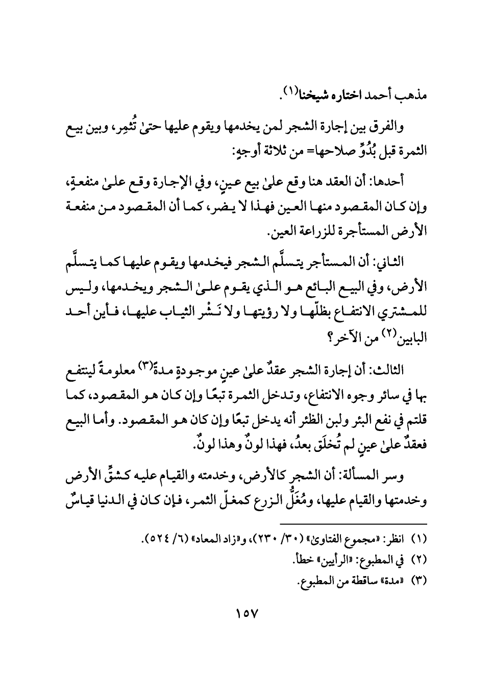 الثاني: أن المستأجر يتسلَّم الشجر فيخدمها ويقوم عليها كما يتسلَّم الأرض، وفي البيع البائع هو الذي يقوم على الشجر ويخدمها، وليس للمشتري الانتفاع بظلّها ولا رؤيتها ولا نَشْر الثياب عليها، فأين أحد البابين (¬٢) من الآخر؟