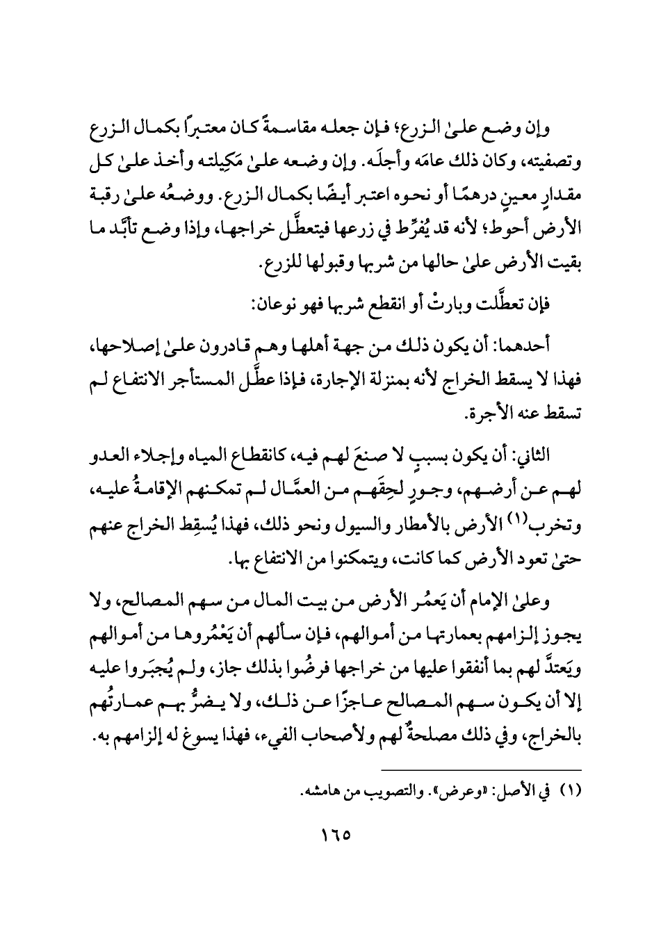 الثاني: أن يكون بسببٍ لا صنعَ لهم فيه، كانقطاع المياه وإجلاء العدو لهم عن أرضهم، وجورٍ لحِقَهم من العمَّال لم تمكنهم الإقامةُ عليه، وتخرب (¬١) الأرض بالأمطار والسيول ونحو ذلك، فهذا يُسقِط الخراج عنهم حتى تعود الأرض كما كانت، ويتمكنوا من الانتفاع بها.