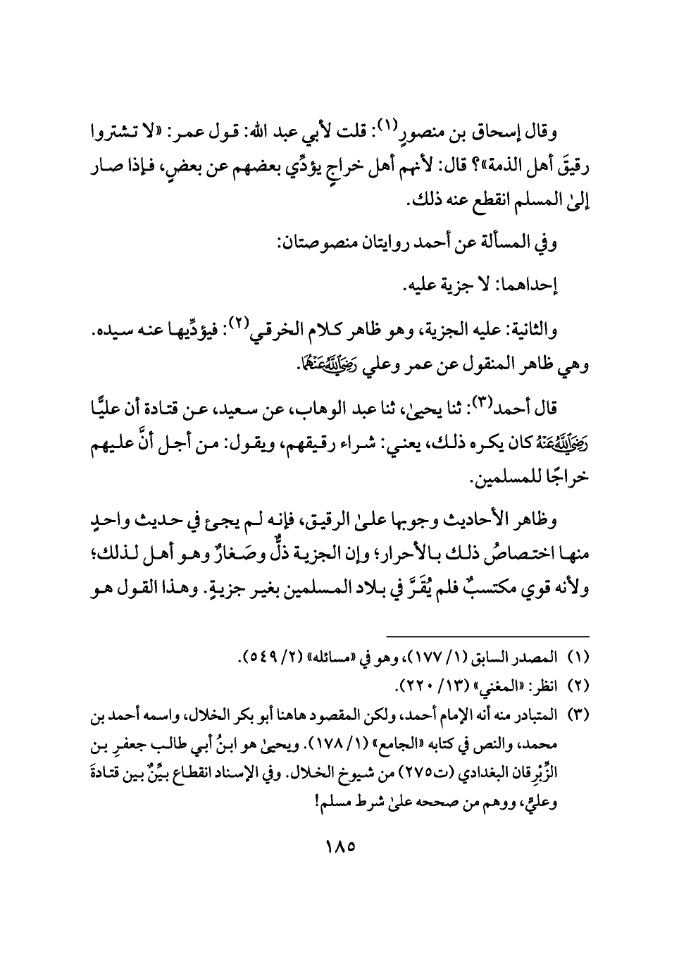 (¬٣) المتبادر منه أنه الإمام أحمد، ولكن المقصود هاهنا أبو بكر الخلال، واسمه أحمد بن محمد، والنص في كتابه "الجامع" (١/ ١٧٨). ويحيى هو ابنُ أبي طالب جعفرِ بن الزِّبْرِقان البغدادي (ت ٢٧٥) من شيوخ الخلال. وفي الإسناد انقطاع بيِّنٌ بين قتادةَ وعليٍّ، ووهم من صححه على شرط مسلم!