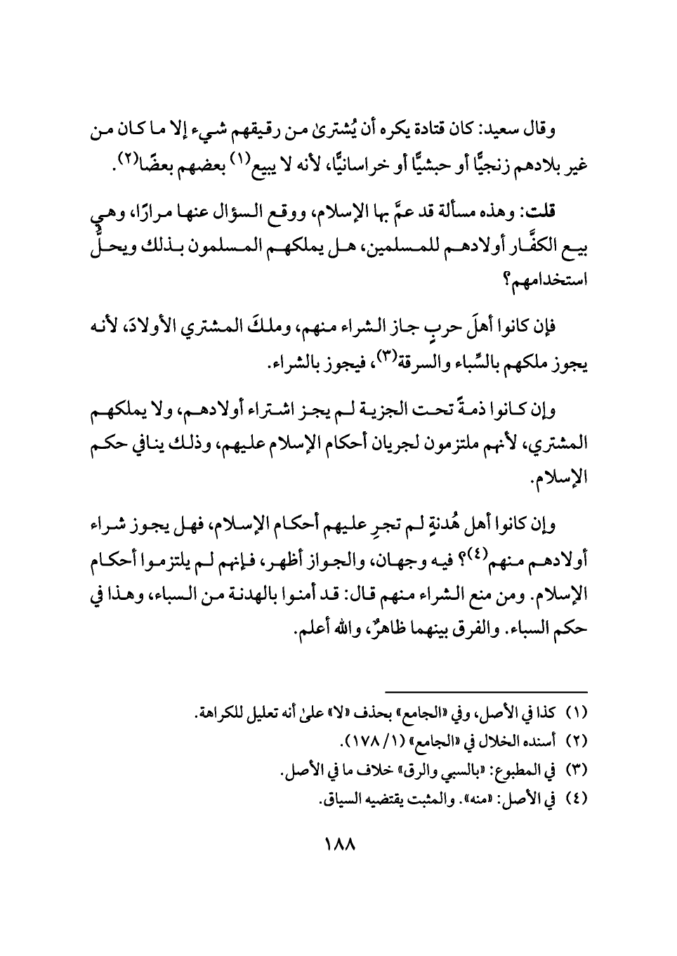 وقال سعيد: كان قتادة يكره أن يُشترى من رقيقهم شيء إلا ما كان من غير بلادهم زنجيًّا أو حبشيًّا أو خراسانيًّا، لأنه لا يبيع (¬١) بعضهم بعضًا (¬٢).