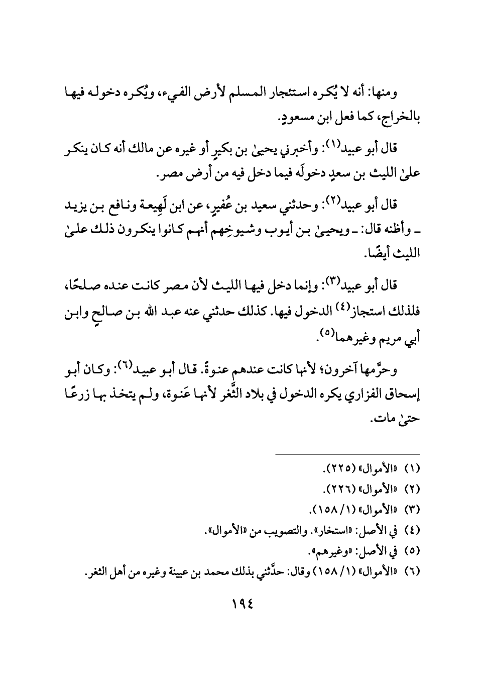 (¬٦) "الأموال" (١/ ١٥٨) وقال: حدَّثني بذلك محمد بن عيينة وغيره من أهل الثغر.