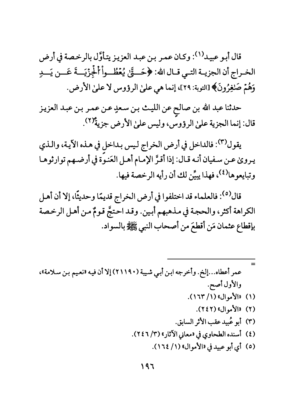 قال أبو عبيد (¬١): وكان عمر بن عبد العزيز يتأوَّل بالرخصة في أرض الخراج أن الجزية التي قال الله: {حَتَّى يُعْطُوا اُلْجِزْيَةَ عَن يَدٍ