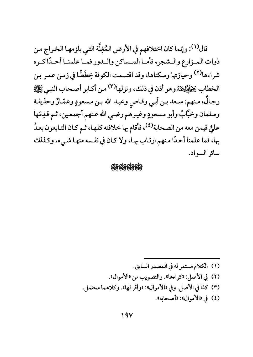 قال (¬١): وإنما كان اختلافهم في الأرض المُغِلَّة التي يلزمها الخراج من ذوات المزارع والشجر، فأما المساكن والدور فما علمنا أحدًا كره شراءها (¬٢) وحيازتها وسكناها، وقد اقتسمت الكوفة خِطَطًا في زمن عمر بن الخطاب - رضي الله عنه - وهو أذن في ذلك، ونزلها (¬٣) من أكابر أصحاب النبي - صلى الله عليه وسلم - رجالٌ، منهم: سعد بن أبي وقاصٍ وعبد الله بن مسعودٍ وعمّارٌ وحذيفة وسلمان وخبَّابٌ وأبو مسعودٍ وغيرهم رضي الله عنهم أجمعين، ثم قدِمَها عليٌّ فيمن معه من الصحابة (¬٤)، فأقام بها خلافته كلها، ثم كان التابعون بعدُ بها، فما علمنا أحدًا منهم ارتاب بها، ولا كان في نفسه منها شيء، وكذلك سائر السواد.