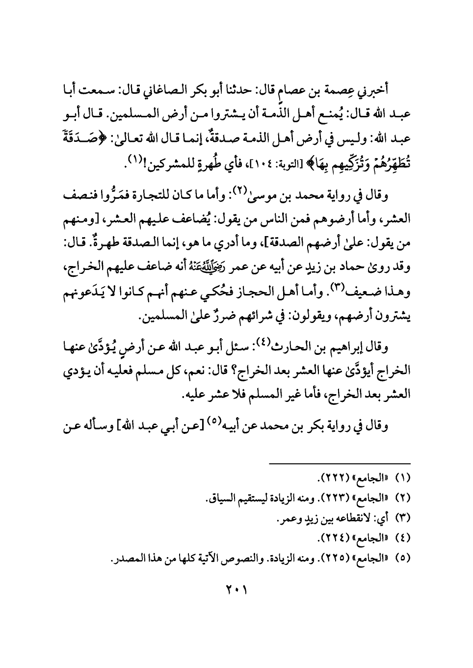أخبرني عِصمة بن عصامٍ قال: حدثنا أبو بكر الصاغاني قال: سمعت أبا عبد الله قال: يُمنع أهل الذمة أن يشتروا من أرض المسلمين. قال أبو عبد الله: وليس في أرض أهل الذمة صدقةٌ، إنما قال الله تعالى: {صَدَقَةٌ تُطَهِّرُهُمْ وَتُزَكِّيهِم بِهَا} [التوبة: ١٠٤]، فأي طُهرةٍ للمشركين! (¬١).