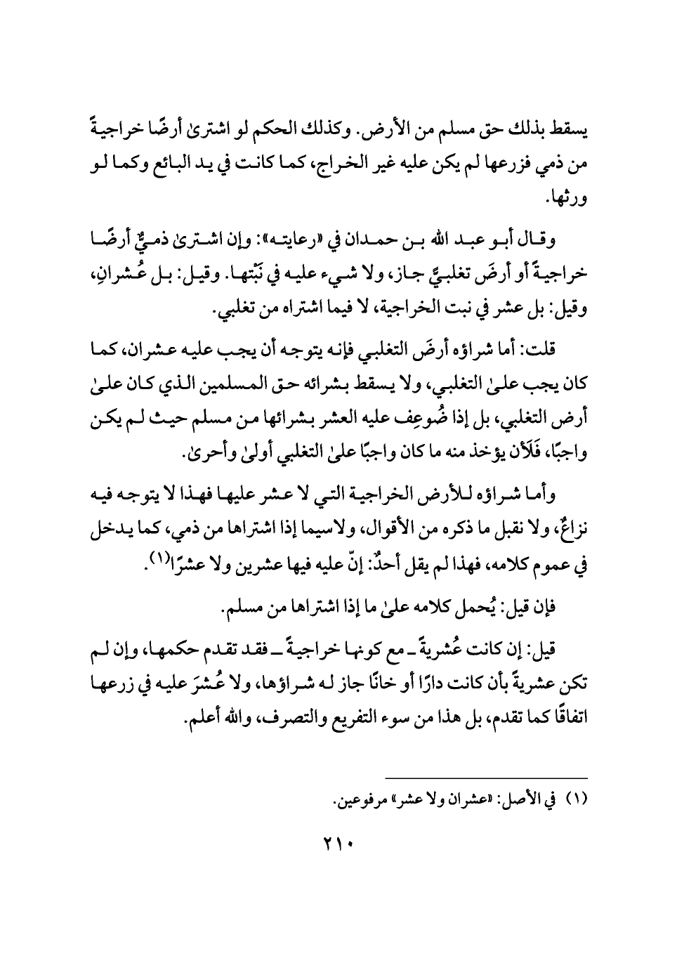 وقال أبو عبد الله بن حمدان في "رعايته": وإن اشترى ذميٌّ أرضًا خراجيةً أو أرضَ تغلبيًّ جاز، ولا شيء عليه في نَبْتها. وقيل: بل عُشرانِ، وقيل: بل عشر في نبت الخراجية، لا فيما اشتراه من تغلبي.