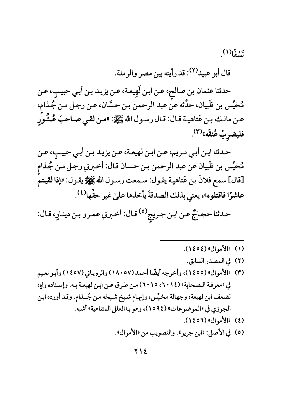 (¬٣) "الأموال" (١٤٥٥)، وأخرجه أيضًا أحمد (١٨٠٥٧) والروياني (١٤٥٧) وأبو نعيم في "معرفة الصحابة" (٦٠١٤، ٦٠١٥) من طرق عن ابن لهيعة به. وإسناده واهٍ، لضعف ابن لهيعة، وجهالة مخيِّس، وإبهام شيخ شيخه من جُذام. وقد أورده ابن الجوزي في "الموضوعات" (١٥٩٤)، وهو بـ"العلل المتناهية" أشبه.