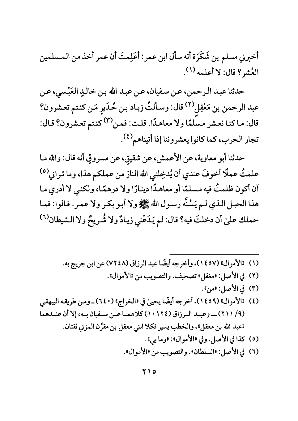حدثنا عبد الرحمن، عن سفيان، عن عبد الله بن خالدٍ العَبْسي، عن عبد الرحمن بن مَعْقِلٍ (¬٢) قال: وسألتُ زياد بن حُدَيرٍ مَن كنتم تعشرون؟ قال: ما كنا نعشر مسلمًا ولا معاهدًا. قلت: فمن (¬٣) كنتم تعشرون؟ قال: تجار الحرب، كما كانوا يعشروننا إذا أتيناهم (¬٤).