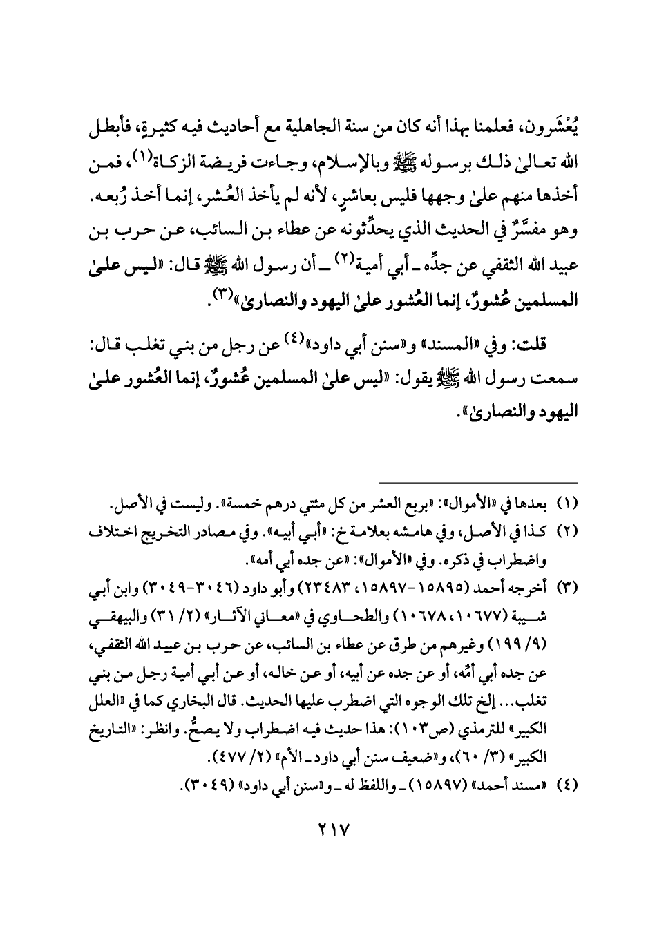 قلت: وفي "المسند" و"سنن أبي داود" (¬٤) عن رجل من بني تغلب قال: سمعت رسول الله - صلى الله عليه وسلم - يقول: "ليس على المسلمين عُشورٌ، إنما العُشور على اليهود والنصارى".