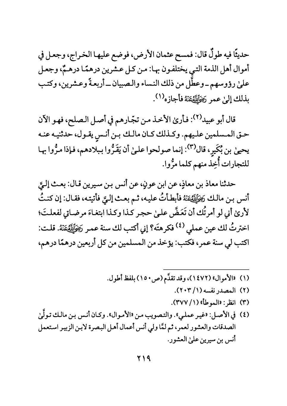 حديثًا فيه طولٌ قال: فمسح عثمان الأرض، فوضع عليها الخراج، وجعل في أموال أهل الذمة التي يختلفون بها: من كل عشرين درهمًا درهمٌ، وجعل على رؤوسهم ــ وعطَّل من ذلك النساء والصبيان ــ أربعةً وعشرين، وكتب بذلك إلى عمر - رضي الله عنه - فأجازه (¬١).