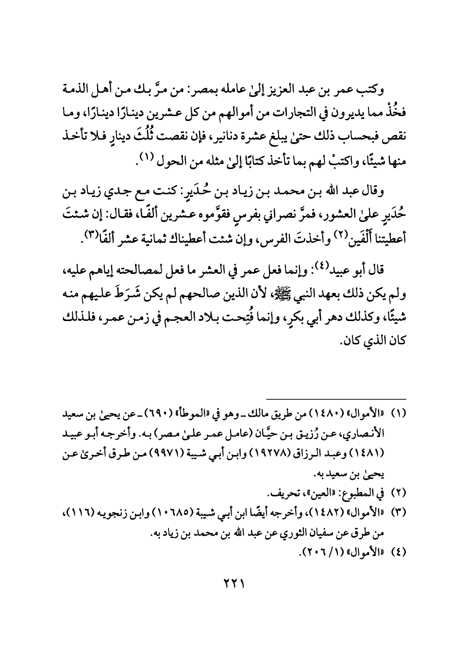 (¬١) "الأموال" (١٤٨٠) من طريق مالك ــ وهو في "الموطأ" (٦٩٠) ــ عن يحيى بن سعيد الأنصاري، عن رُزيق بن حيَّان (عامل عمر على مصر) به. وأخرجه أبو عبيد (١٤٨١) وعبد الرزاق (١٩٢٧٨) وابن أبي شيبة (٩٩٧١) من طرق أخرى عن يحيى بن سعيد به.