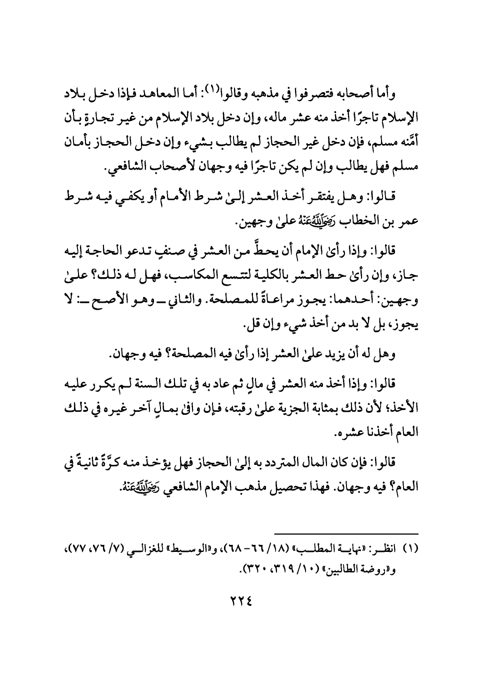 قالوا: وهل يفتقر أخذ العشر إلى شرط الأمام أو يكفي فيه شرط عمر بن الخطاب - رضي الله عنه - على وجهين.