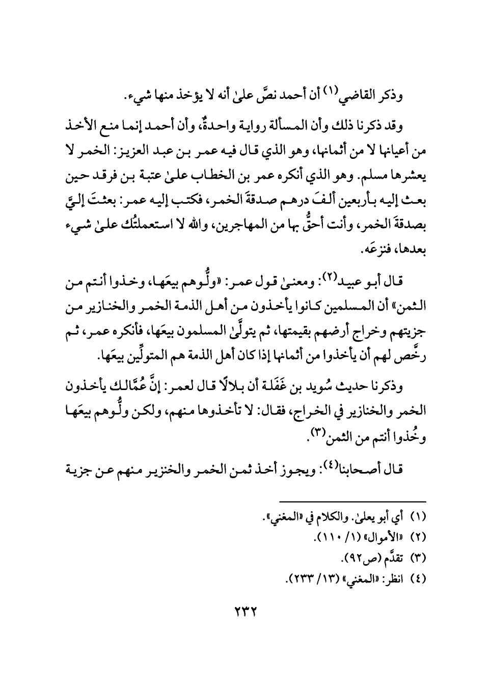وقد ذكرنا ذلك وأن المسألة رواية واحدةٌ، وأن أحمد إنما منع الأخذ من أعيانها لا من أثمانها، وهو الذي قال فيه عمر بن عبد العزيز: الخمر لا يعشرها مسلم. وهو الذي أنكره عمر بن الخطاب على عتبة بن فرقد حين بعث إليه بأربعين ألفَ درهم صدقةَ الخمر، فكتب إليه عمر: بعثتَ إليَّ بصدقةَ الخمر، وأنت أحقُّ بها من المهاجرين، والله لا استعملتُك على شيء بعدها، فنزعَه.