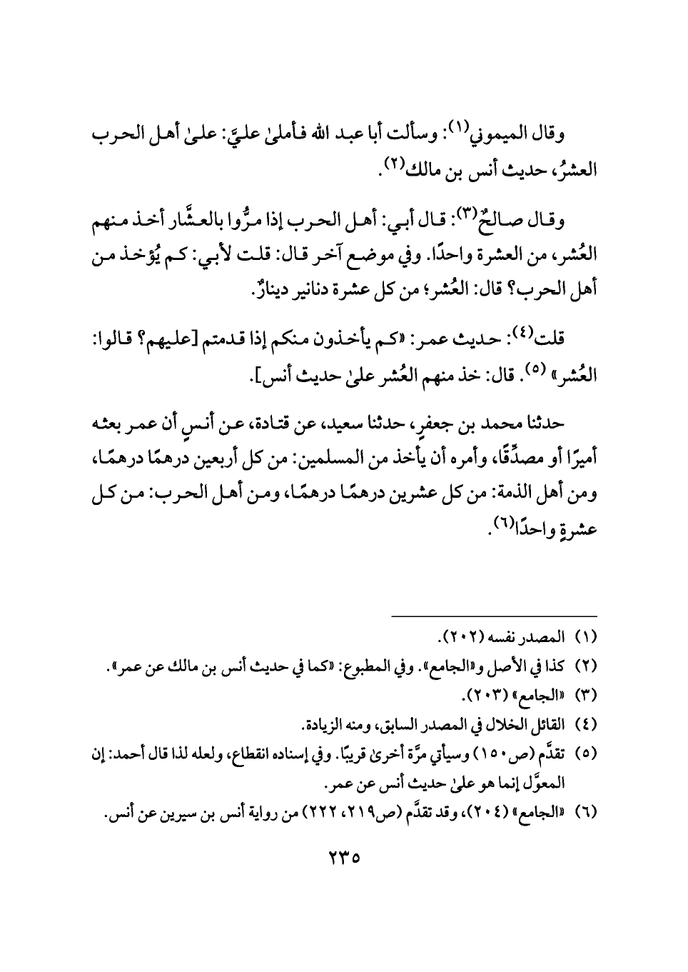 وقال صالحٌ (¬٣): قال أبي: أهل الحرب إذا مرُّوا بالعشَّار أخذ منهم العُشر، من العشرة واحدًا. وفي موضع آخر قال: قلت لأبي: كم يُؤخذ من أهل الحرب؟ قال: العُشر؛ من كل عشرة دنانير دينارٌ.