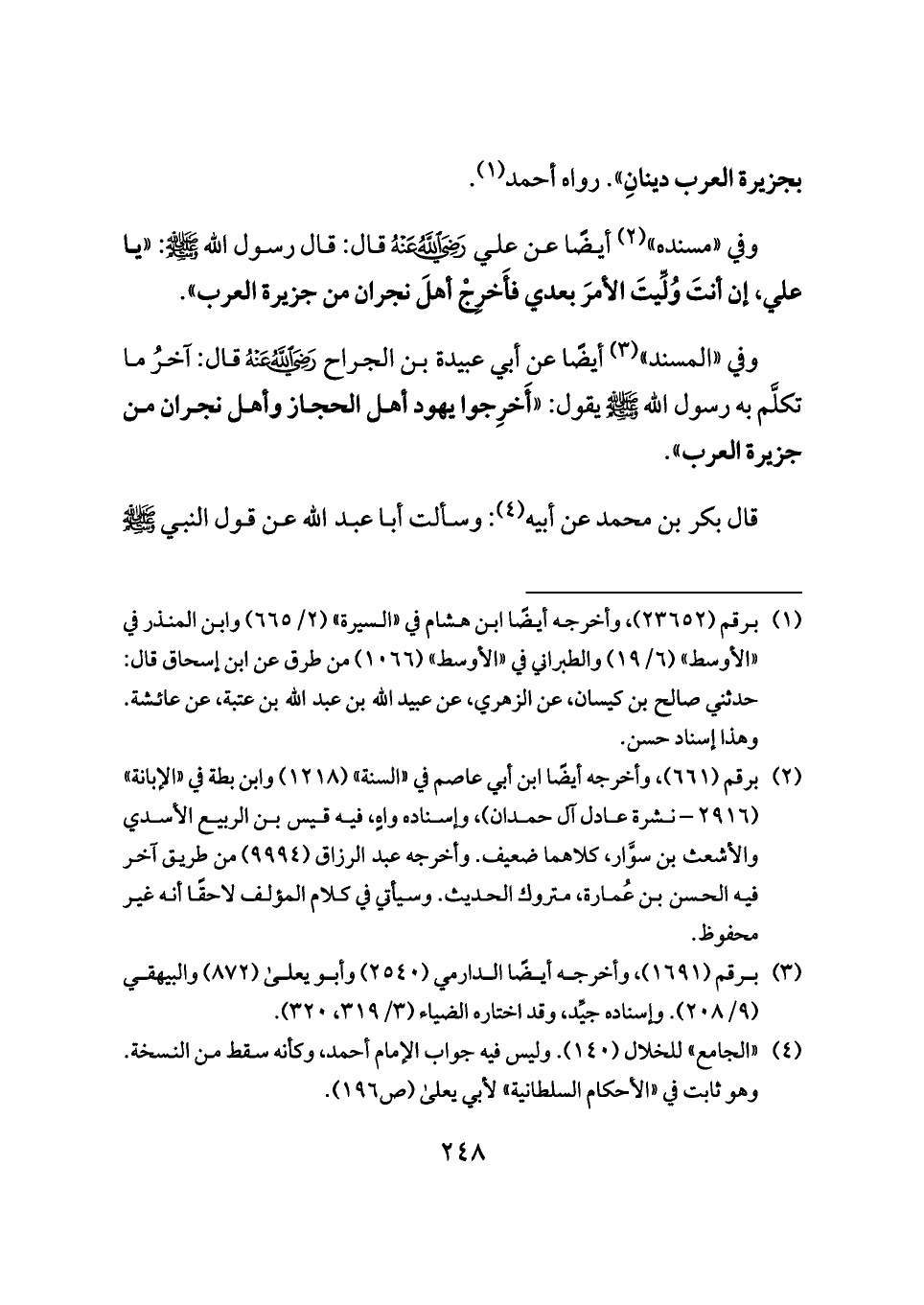 وفي "المسند" (¬٣) أيضًا عن أبي عبيدة بن الجراح - رضي الله عنه - قال: آخرُ ما تكلَّم به رسول الله - صلى الله عليه وسلم - يقول: "أَخرِجوا يهود أهل الحجاز وأهل نجران من جزيرة العرب".