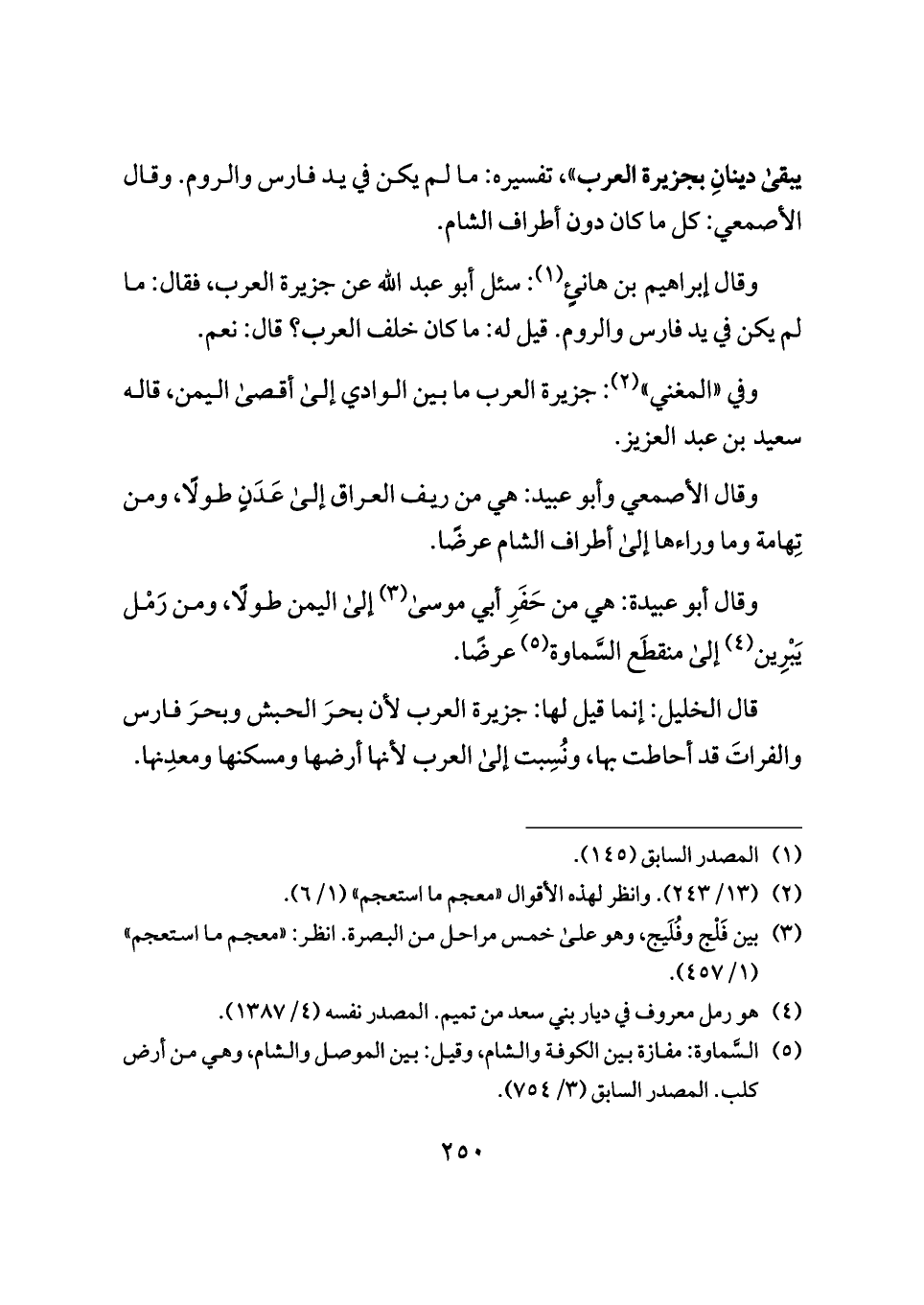 يبقى دينانِ بجزيرة العرب"، تفسيره: ما لم يكن في يد فارس والروم. وقال الأصمعي: كل ما كان دون أطراف الشام.