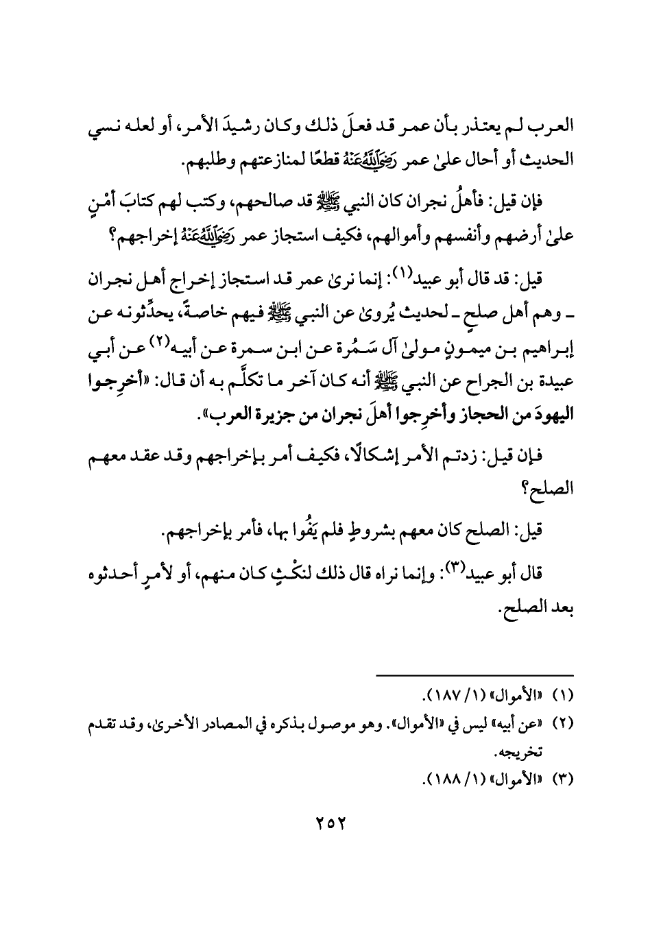 قيل: قد قال أبو عبيد (¬١): إنما نرى عمر قد استجاز إخراج أهل نجران ــ وهم أهل صلحٍ ــ لحديث يُروى عن النبي - صلى الله عليه وسلم - فيهم خاصةً، يحدِّثونه عن إبراهيم بن ميمونٍ مولى آل سَمُرة عن ابن سمرة عن أبيه (¬٢) عن أبي عبيدة بن الجراح عن النبي - صلى الله عليه وسلم - أنه كان آخر ما تكلَّم به أن قال: "أخرِجوا اليهودَ من الحجاز وأخرِجوا أهلَ نجران من جزيرة العرب".