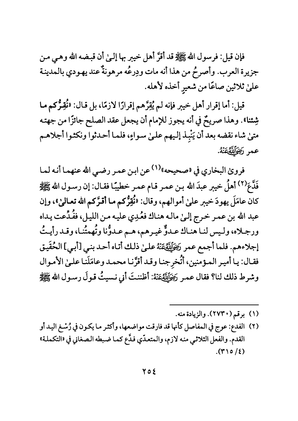 فروى البخاري في "صحيحه" (¬١) عن ابن عمر رضي الله عنهما أنه لما فَدَّعَ (¬٢) أهلُ خيبر عبدَ الله بن عمر قام عمر خطيبًا فقال: إن رسول الله - صلى الله عليه وسلم - كان عامَلَ يهودَ خيبر على أموالهم، وقال: "نُقِرُّكم ما أقرَّكم الله تعالى"، وإن عبد الله بن عمر خرج إلى ماله هناك فعُدِي عليه من الليل، ففُدِّعت يداه ورجلاه، وليس لنا هناك عدوٌّ غيرهم، هم عدوُّنا وتُهمتُنا، وقد رأيتُ إجلاءهم. فلما أجمع عمر - رضي الله عنه - على ذلك أتاه أحد بني [أبي] الحُقَيق فقال: يا أمير المؤمنين، أتُخرِجنا وقد أقرَّنا محمد وعامَلَنا على الأموال وشرط ذلك لنا؟ فقال عمر - رضي الله عنه -: أظننتَ أني نسيتُ قولَ رسول الله - صلى الله عليه وسلم -