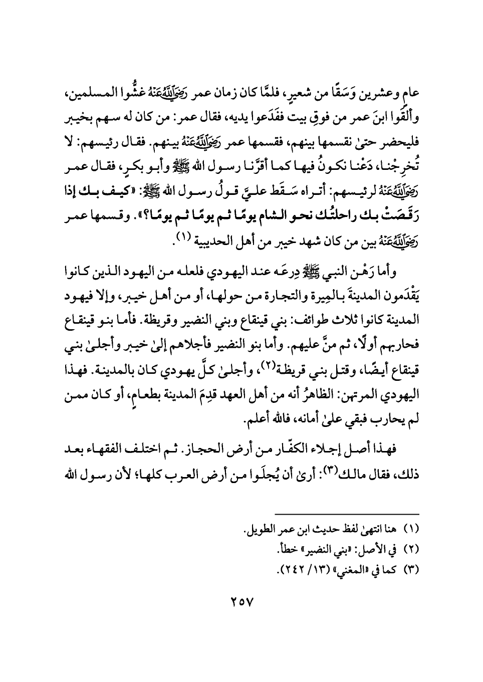 عامٍ وعشرين وَسَقًا من شعيرٍ، فلمَّا كان زمان عمر - رضي الله عنه - غشُّوا المسلمين، وألقَوا ابنَ عمر من فوقِ بيت ففَدَعوا يديه، فقال عمر: من كان له سهم بخيبر فليحضر حتى نقسمها بينهم، فقسمها عمر - رضي الله عنه - بينهم. فقال رئيسهم: لا تُخرِجْنا، دَعْنا نكونُ فيها كما أقرَّنا رسول الله - صلى الله عليه وسلم - وأبو بكرٍ، فقال عمر - رضي الله عنه - لرئيسهم: أتراه سَقَط عليَّ قولُ رسول الله - صلى الله عليه وسلم -: "كيف بك إذا رَقَصَتْ بك راحلتُك نحو الشام يومًا ثم يومًا ثم يومًا؟ ". وقسمها عمر - رضي الله عنه - بين من كان شهد خيبر من أهل الحديبية (¬١).