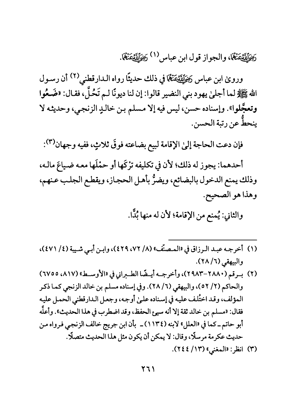 وروى ابن عباس - رضي الله عنهما - في ذلك حديثًا رواه الدارقطني (¬٢) أن رسول الله - صلى الله عليه وسلم - لما أجلى يهود بني النضير قالوا: إن لنا ديونًا لم تَحُلَّ، فقال: "ضَعُوا وتعجَّلوا". وإسناده حسن، ليس فيه إلا مسلم بن خالدٍ الزنجي، وحديثه لا ينحطُّ عن رتبة الحسن.