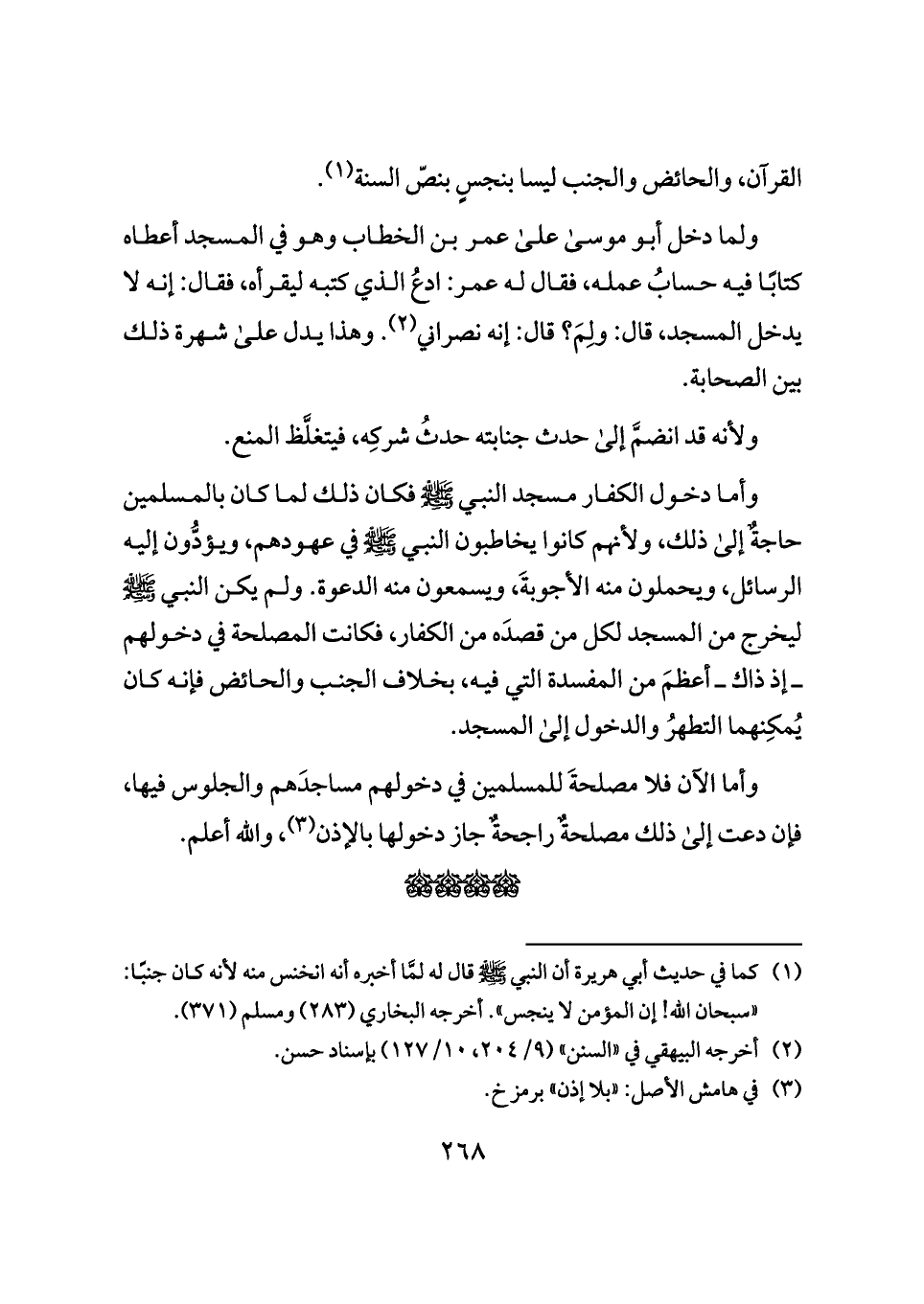 وأما دخول الكفار مسجد النبي - صلى الله عليه وسلم - فكان ذلك لما كان بالمسلمين حاجةٌ إلى ذلك، ولأنهم كانوا يخاطبون النبي - صلى الله عليه وسلم - في عهودهم، ويؤدُّون إليه الرسائل، ويحملون منه الأجوبةَ، ويسمعون منه الدعوة. ولم يكن النبي - صلى الله عليه وسلم - ليخرج من المسجد لكل من قصدَه من الكفار، فكانت المصلحة في دخولهم ــ إذ ذاك ــ أعظمَ من المفسدة التي فيه، بخلاف الجنب والحائض فإنه كان يُمكِنهما التطهرُ والدخول إلى المسجد.