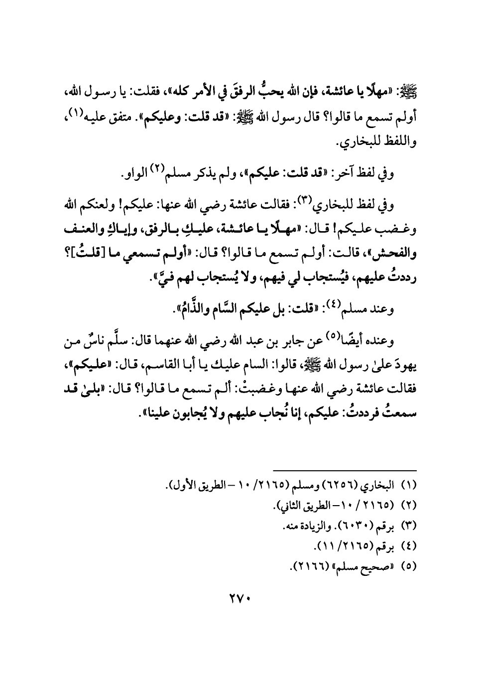 وعنده أيضًا (¬٥) عن جابر بن عبد الله رضي الله عنهما قال: سلَّم ناسٌ من يهودَ على رسول الله - صلى الله عليه وسلم -، قالوا: السام عليك يا أبا القاسم، قال: "عليكم"، فقالت عائشة رضي الله عنها وغضبتْ: ألم تسمع ما قالوا؟ قال: "بلى قد سمعتُ فرددتُ: عليكم، إنا نُجاب عليهم ولا يُجابون علينا".