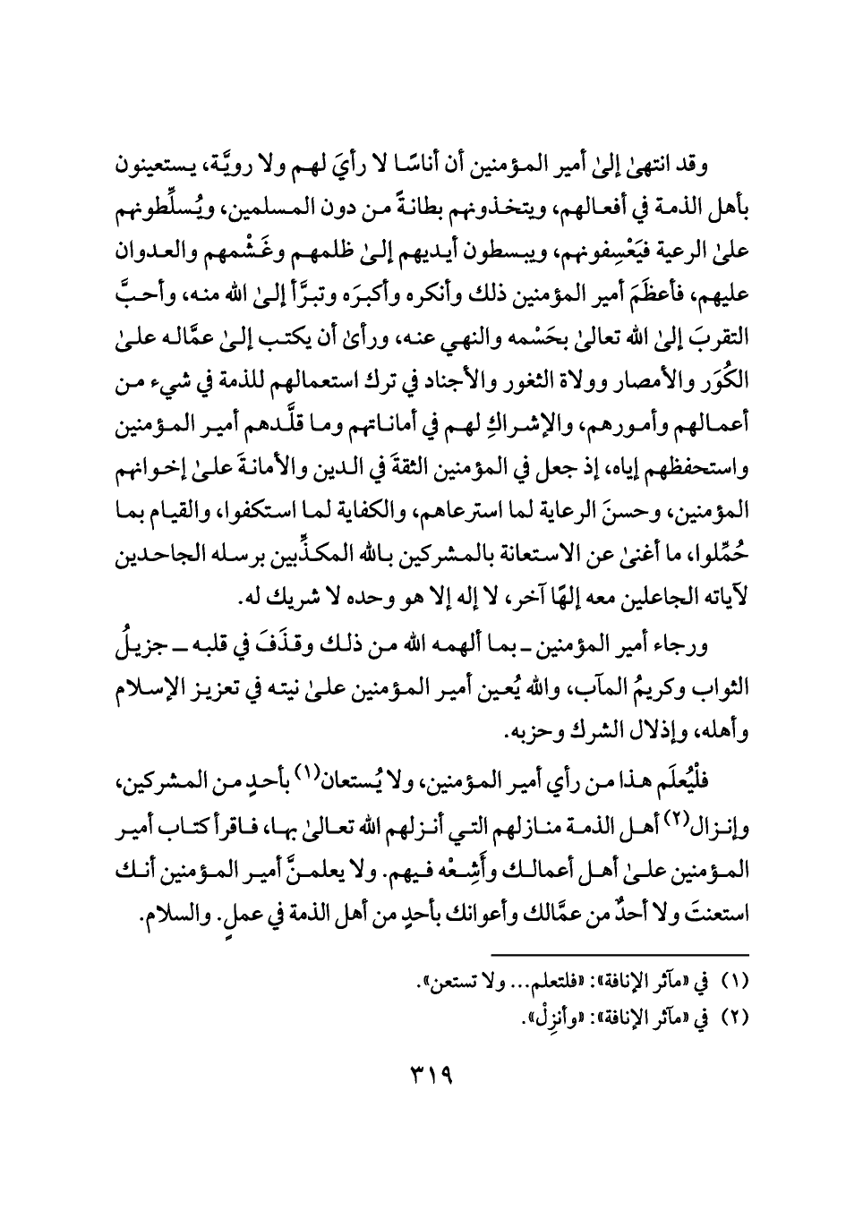 فلْيُعلَم هذا من رأي أمير المؤمنين، ولا يُستعان (¬١) بأحدٍ من المشركين، وإنزال (¬٢) أهل الذمة منازلهم التي أنزلهم الله تعالى بها، فاقرأ كتاب أمير المؤمنين على أهل أعمالك وأَشِعْه فيهم. ولا يعلمنَّ أمير المؤمنين أنك استعنتَ ولا أحدٌ من عمَّالك وأعوانك بأحدٍ من أهل الذمة في عملٍ. والسلام.